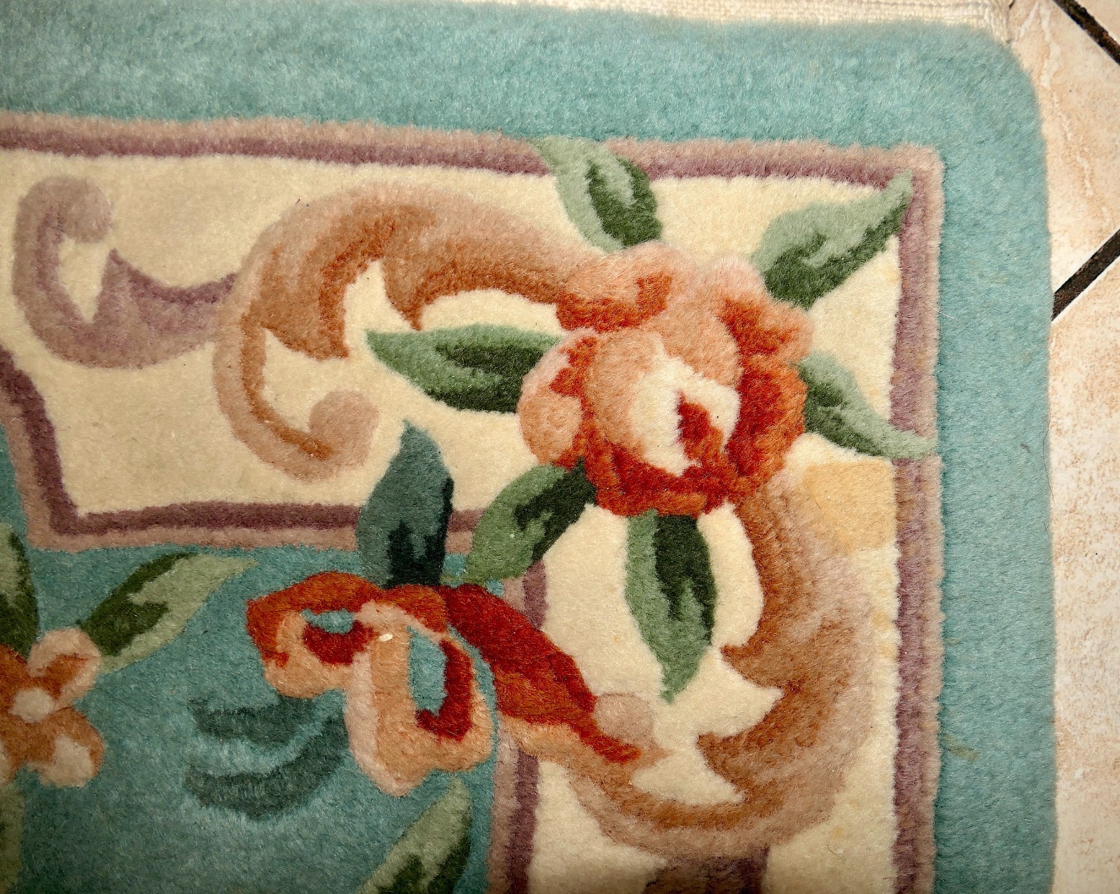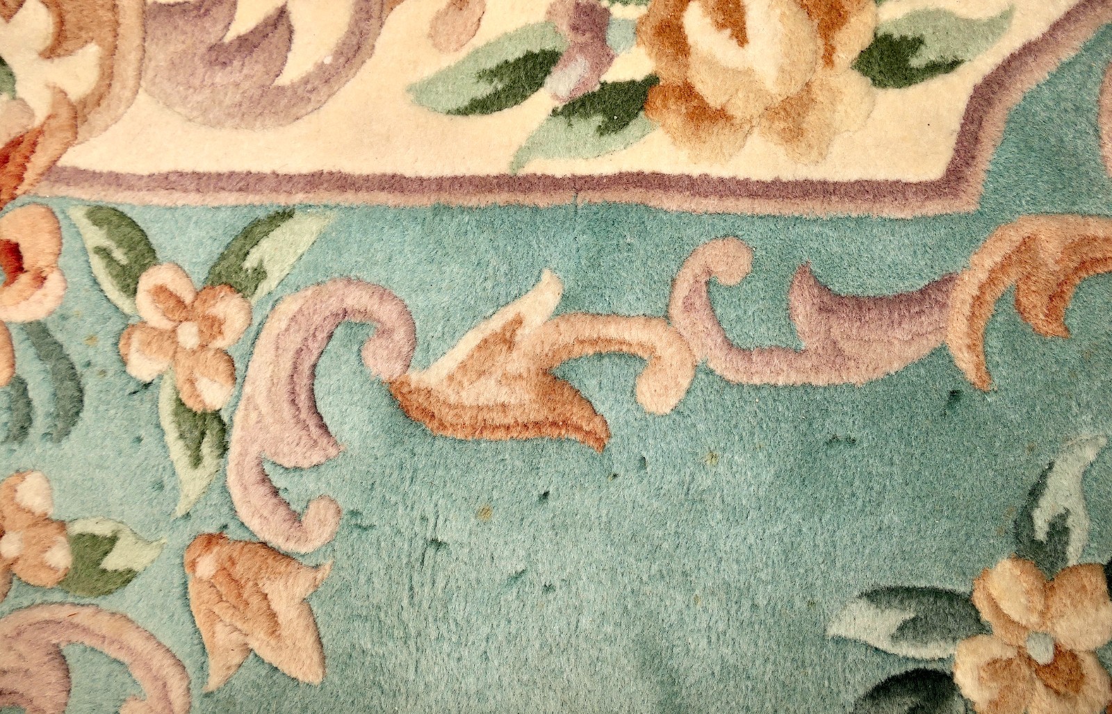 We are pleased to offer for your consideration Immaculate Chinese Hand Knotted Aubusson Design Sculptured Thick Plush Colorful Peking Rugfeatures high quality fine hand knotted fringed rectangular rug, dating to mid 20th century, with scrolling floral Aubusson design over a primarily soft teal or aqua blue colored field, with cream/ivory central medallion and borders with florals and scrolls in shades of pink/purplish, green, burgundy/brown and beige. The rug is finished with wide full white fringes by the ends.There is an original dark blue textile tag with