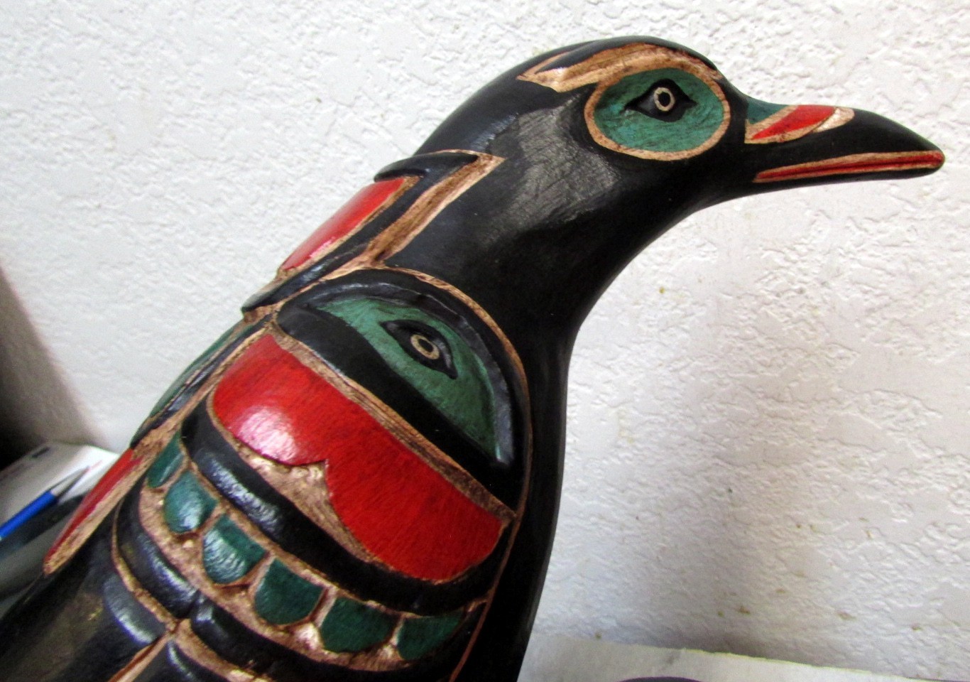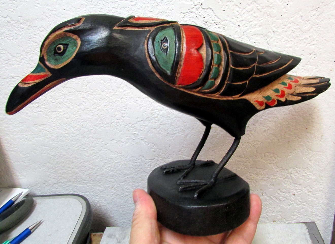 Hand Carved Tribal style Wood Raven figure 12 inches long, great Home, Cabin or lodge decor unique collectible! beautiful! measures approx 12 inches long 7.5 tall (roughly)hand carved in Indonesia using an Alaska design from a man in Washington who designs them - each is individually madeso the one you see in the photo wont be the one you get, but they are all similar Hello from Alaska **Any questions about this item, please ask :)** **We do combine shipping - if wanting a quote - just ask :)***We offer local pick-up (we have a storefront in Fairbanks, Alaska - it's called Alaska Transfers & Design in the Regency Court Mall on College Road) * Click here to check out our other items! We have LOTS of vintage items, Alaska souvenirs, collectibles, novelties and much more listed in our store !! **Customers Buying Multiple items**If you purchase more then 1 item please DO NOT pay for each separately - Please put all the items you want to buy in the cart, then use the "ask the seller for a total" option, so we can send you a new invoice with the postage set correctly for multiple items, it may save you $$ in shipping costs - I am told that option is hard to find on the phone app - no worries, we do refund shipping overages. SHIPPING NOTES:We offer 1 day handling, meaning we mail items within 24 hours of purchase (except on weekends and non mailing holidays of course) , but seeing how we are in North Pole Alaska, items may take 3-5 days longer to arrive at the destination than what eBay's notice quotes. They no longer process mail in Alaska, so an item I mail here takes 1 day to get from North Pole to Anchorage, then usually 1 day to be flown to a processing center, then 1 day to get sorted. So there's a lag time of about 3 days in there that eBay does not take into consideration for Sellers that are in Alaska. So please keep that in mind when buying from us to add those extra travel days to the expected arrival time that eBay sends you. Thank You! **Sales Tax**eBay does collect sales tax for towns & states that have a sales tax - we personally do not see any of that money, it is handled by eBay. **International Buyers** – We ship internationally using eBay's Global Shipping Program **Special note on arrival timesInternational mail has taken anywhere from 7 days to a month to arrive, (item can be held up in customs or at anywhere along the line) this is just how the postal system works, we mail things out the same day / next day after the item is paid for and hopefully that helps in getting the item to you as fast as the postal system can get it there. ***Please Note:The photos are taken on a measuring mat or next to a ruler for sizing. Measurements are in 1 inch increments - if you have a question about the measurements, please ask...