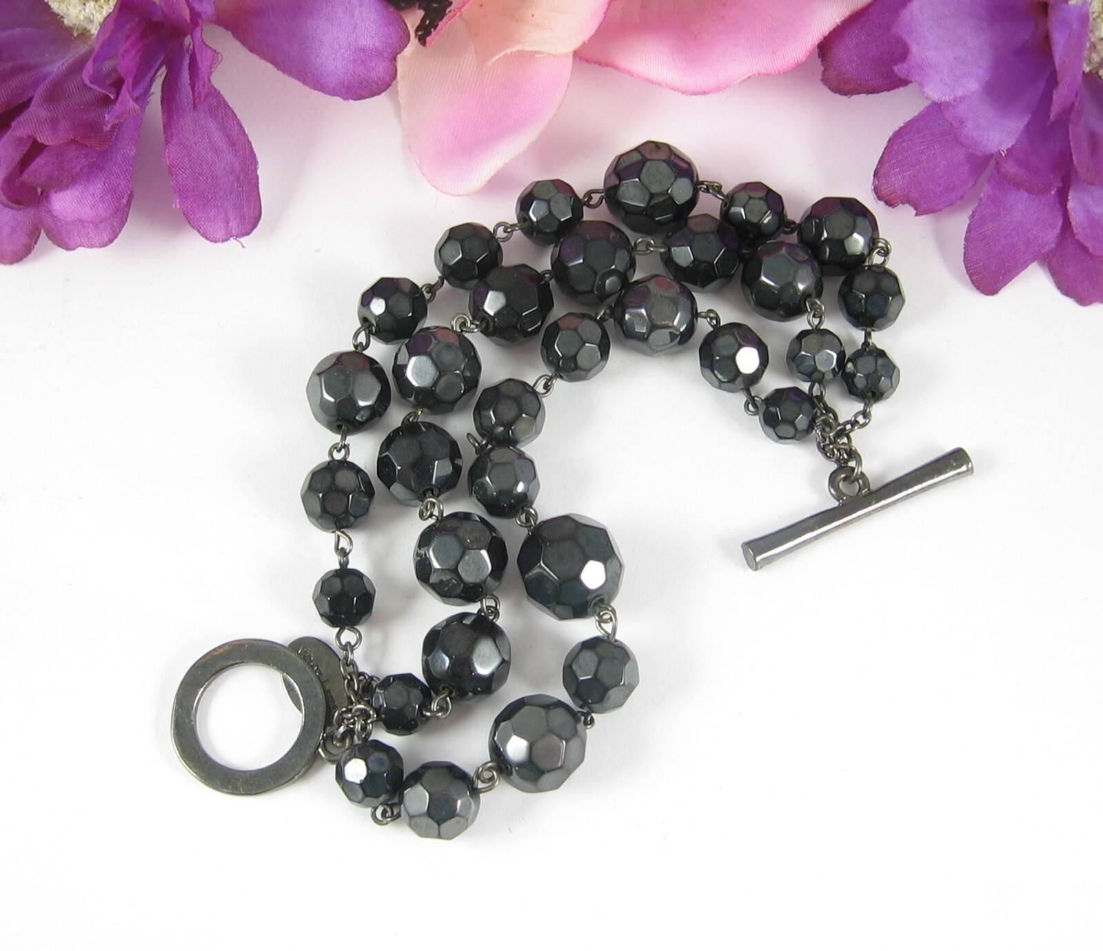 White House Black Market TRIPLE STRAND BLACK GLASS BEAD BRACELET Gunmetal Gray 7