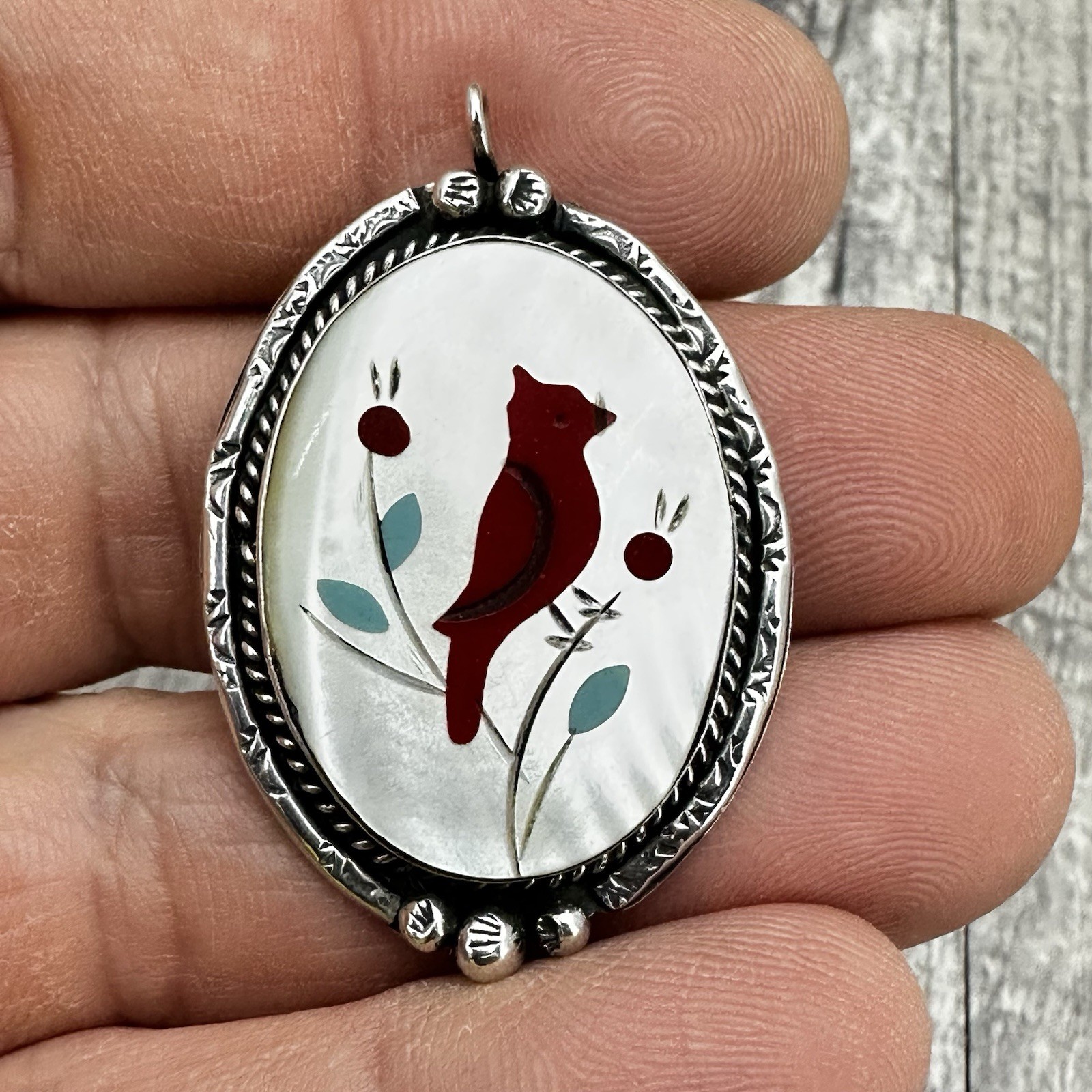 Vintage Zuni Cardinal Inlay Jewelry Set Bracelet Pendant Rings Sterling SilverMatching vintage Zuni jewelry set including cuff bracelet, pendant, and two rings. Each piece features oval mother-of-pearl inlay with red cardinal bird motifs, turquoise-