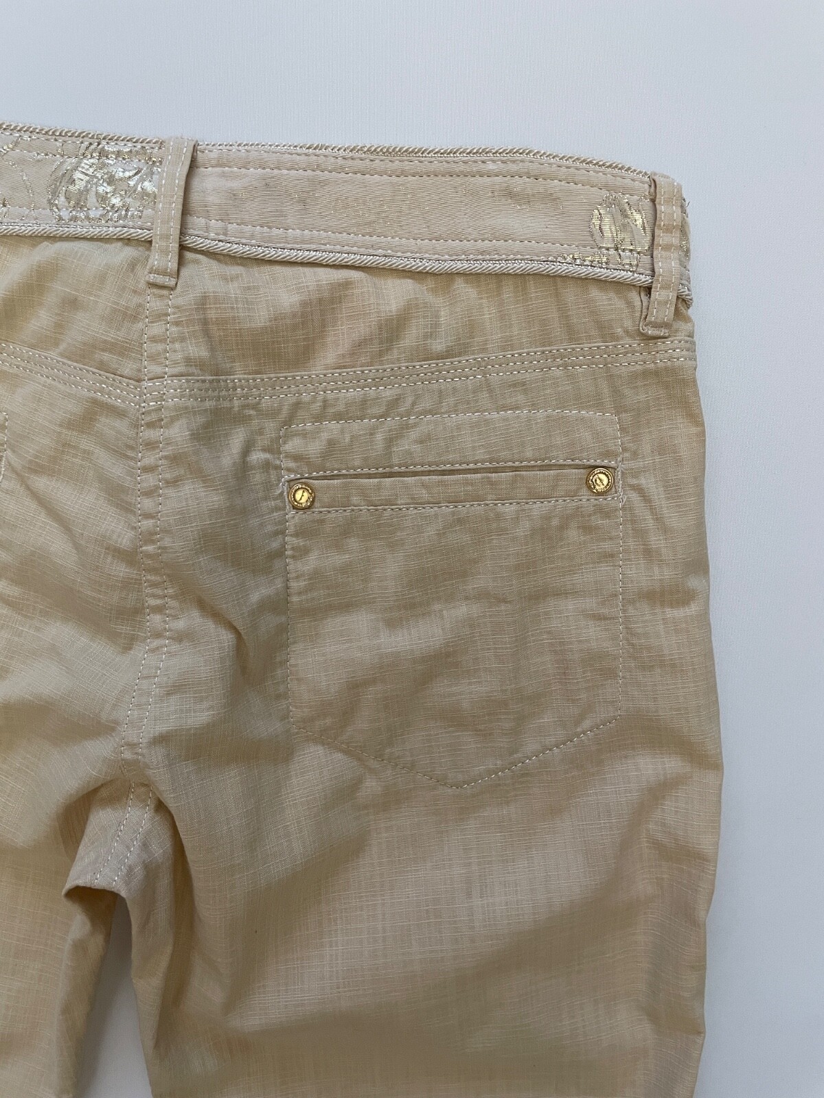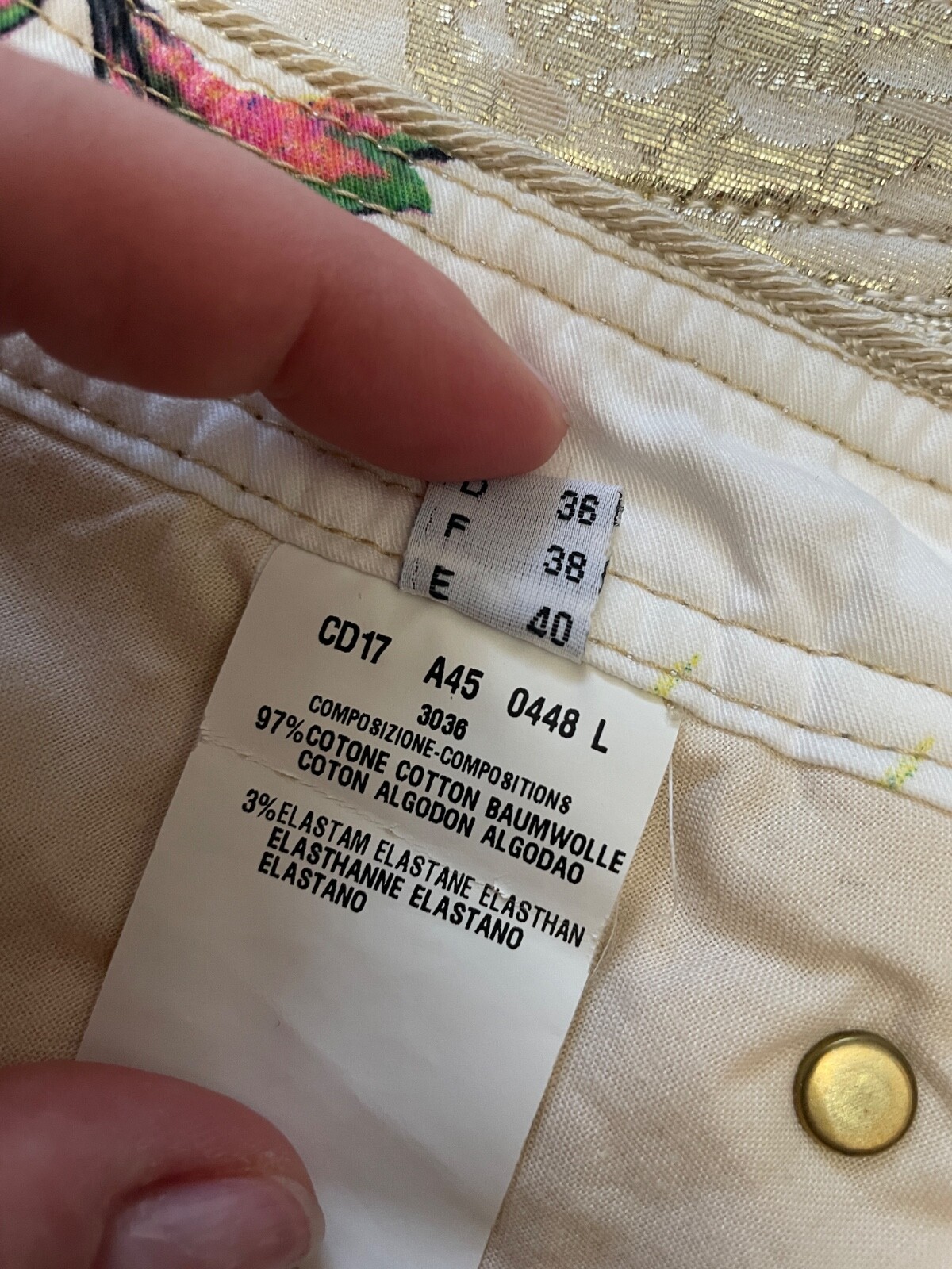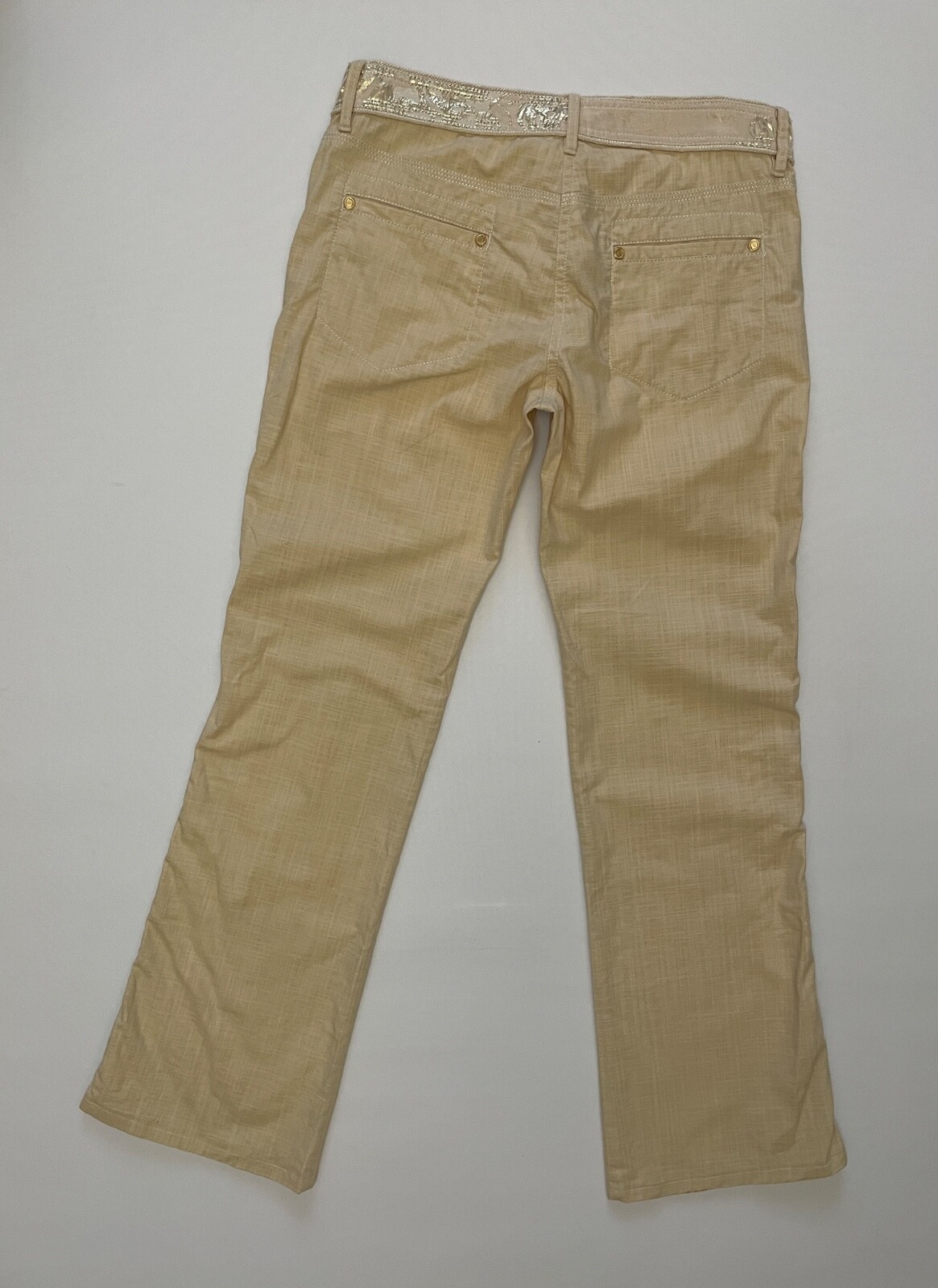 97% Cotton, 3% Elastane.A button is missing at the waistband. There are black dots on the lower part of the leg (last photo).Size on the tag I 42 / USA 8Outseam: 94 cmInseam: 76 cmRise: 21/29 cm1/2 Waist: 37 cm1/2 Hips: 46 cm1/2 Leg opening: 22 cm