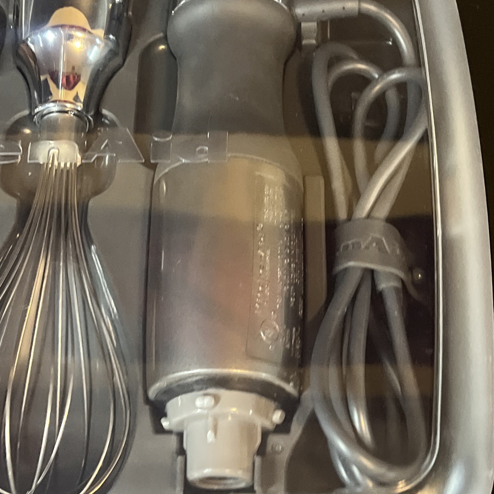 This KitchenAid immersion hand blender comes with attachments and a storage case, ideal for everyday blending tasks in the kitchen. It is gently pre-owned, tested, and working, with only minimal wear from normal use. Free shipping is included with purchase. For included pieces, exact attachment types, and any additional notes not listed here, check the listing for details.