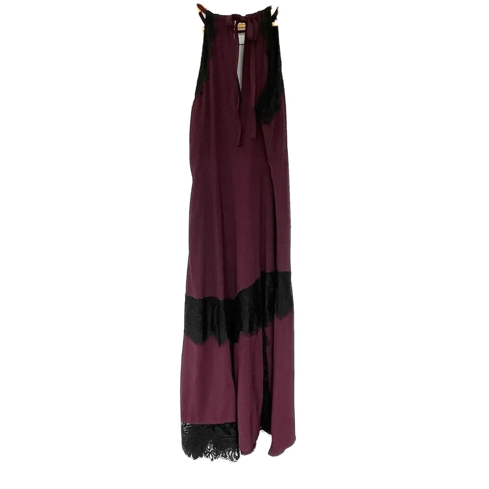 NWT Moulinette Souers Wine Halter Maxi Dress. Black Lace Accent. Sexy Sheath dress with black lace panels. Halter ties in back with key hole opening in front and backAsymmetric hem Lined with chiffon skirt Perfect preowned conditionWedding. Formal. Cocktail party.