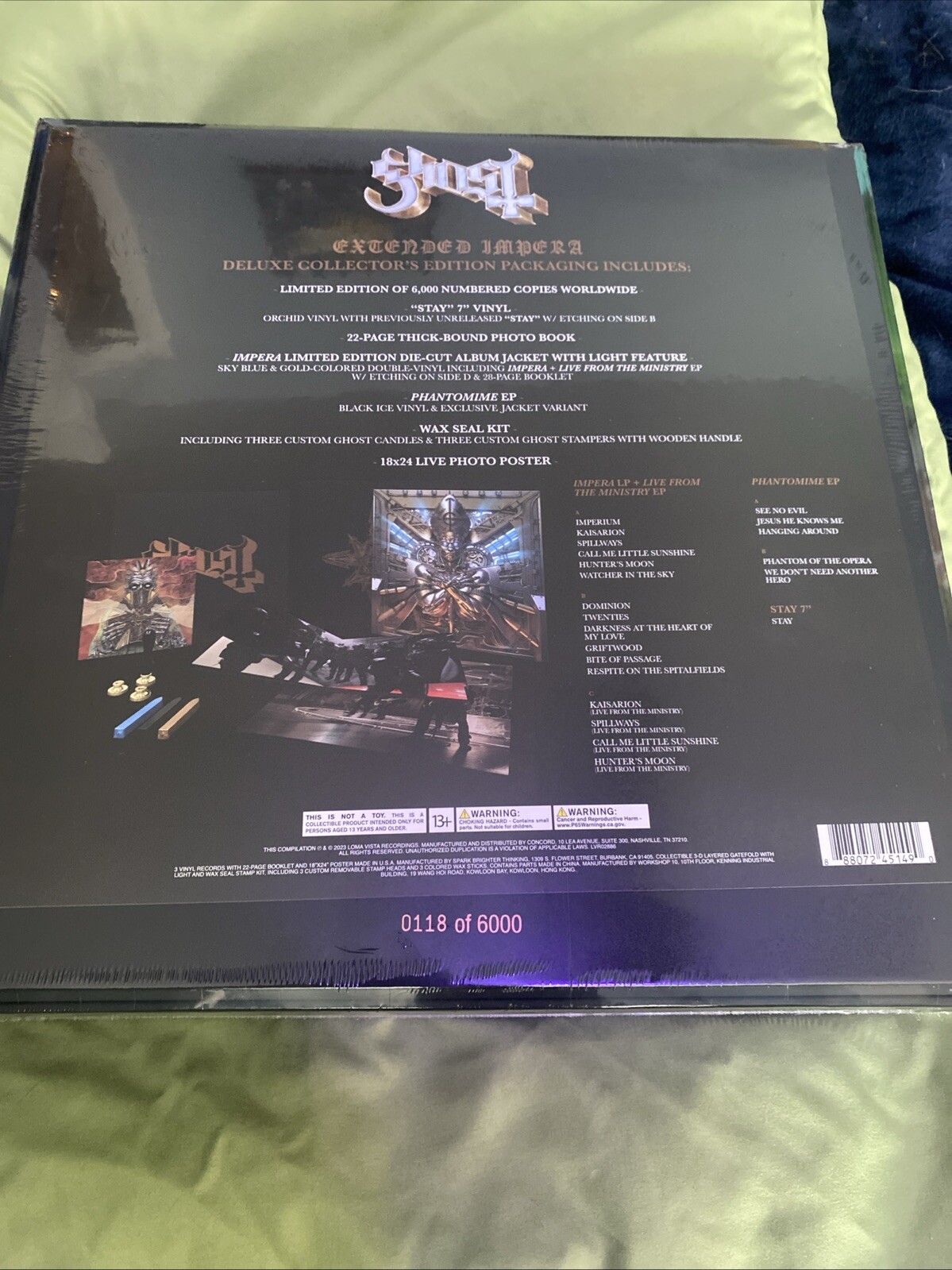 DELUXE COLLECTOR'S EDITION PACKAGING INCLUDES:LIMITED EDITION NUMBER 118 OF 6,000 NUMBERED COPIES WORLDWIDE- "STAY" 7" VINYL -ORCHID VINYL WITH PREVIOUSLY UNRELEASED «STAYS W/ ETCHING ON SIDE B22-PAGE THICK-BOUND PHOTO BOOKIMPERA LIMITED EDITION DIE-CUT ALBUMJACKET WITH LIGHT FEATURE SKY BLUE & GOLD COLORED DOUBLE-VINYL INCLUDING IMPERA + LIVE FROM THE MINISTRY EPW/ FTCHING ON SIDE D & 28-PAGE BOOKLET- PHANTOMIME EPBLACK ICE VINYL & EXCLUSIVE JACKET VARIANT- WAX SEAL KITINCLUDING THREE CUSTOM GHOST CANDLES & THREE CUSTOM GHOST STAMPERS WITH WOODEN HANDLE- 18×24 LIVE PHOTO POSTER