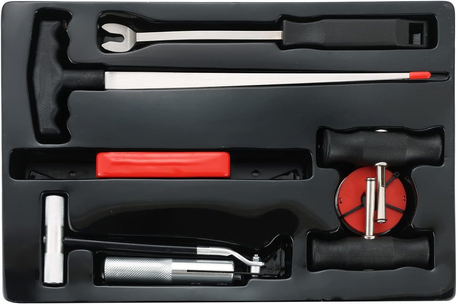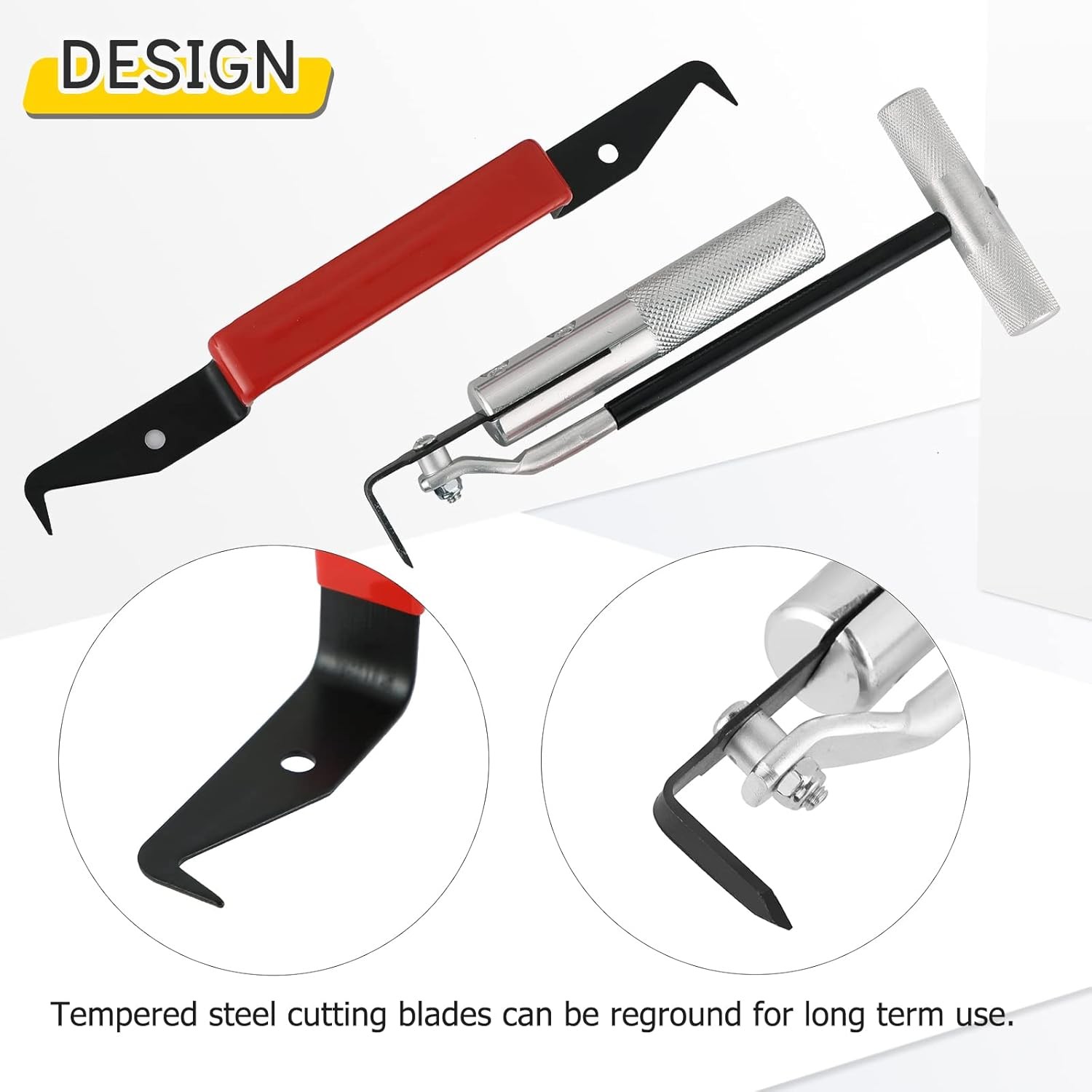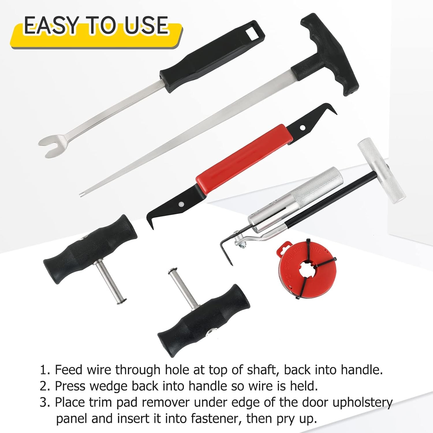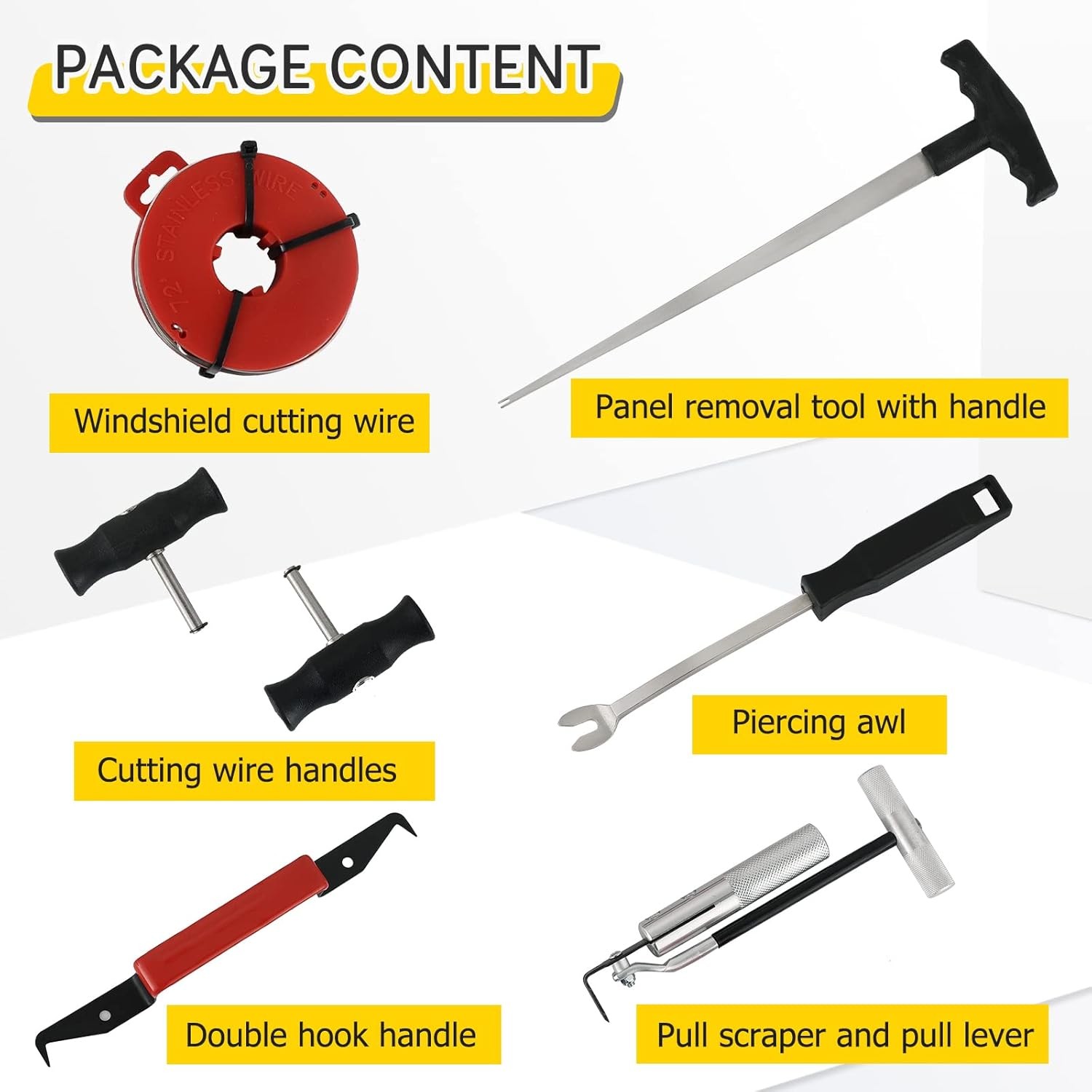 7PCS Windshield Removal Tool Kit | Automotive Wind Glass Remover Hand Tool, Windscreen Remover Set for Classic Vintage CarGlued windscreens removal tool: This windshield removal tool kit is designed to cut the molded adhesive caulking compound around windows. It works effectively on older vehicles and is also suitable for removing tailgate and rear quarter light windows. Premium Quality: The wire is constructed from galvanized steel for maximum strength and longevity. The heat-treated chrome finish shaft resists corrosion, and the durable plastic and hard rubber composite handles provide a secure grip, reducing user fatigue and enhancing productivity. Easy to Use: With this practical windscreen remover set, you can safely and quickly remove the windshield from your vehicle. The windshield removal tool is capable of cutting vinyl adhesive compound around the windshield. The wire feeder tool is designed for easy and flexible insertion of wire through polyurethane. Simply feed the wire through the hole in the wedge shaft, loop it through the hole at the top of the shaft, and back into the handle, then press the wedge back into the handle to hold the wire. Place the trim pad remover under the edge of the door upholstery panel and insert it into the fastener as far as possible, then pry up. Wide Application: This automotive wind glass remover hand tool is compatible with a variety of domestic and imported cars and light trucks. Package Included: 1 x windshield cutting wire, 2 x cutting wire handles, 1 x double hook handle, 1 x piercing awl, 1 x pull scraper and pull lever, 1 x panel removal tool with handle. Dimensions: 15.43 x 10.47 x 2.05 inches.