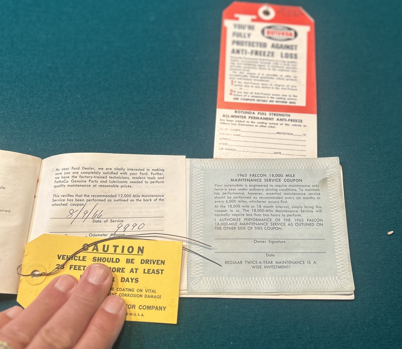 The 1963 Ford Falcon Owners Manual is a comprehensive guide specifically designed for owners of Ford Falcon vehicles from the year 1963. This manual provides detailed information on operating and maintaining the vehicle, making it a valuable addition for any Ford Falcon owner. This was originally owned by someone in Ardmore, Pennsylvania. In very good condition for its age.Includes tags In pictures.
