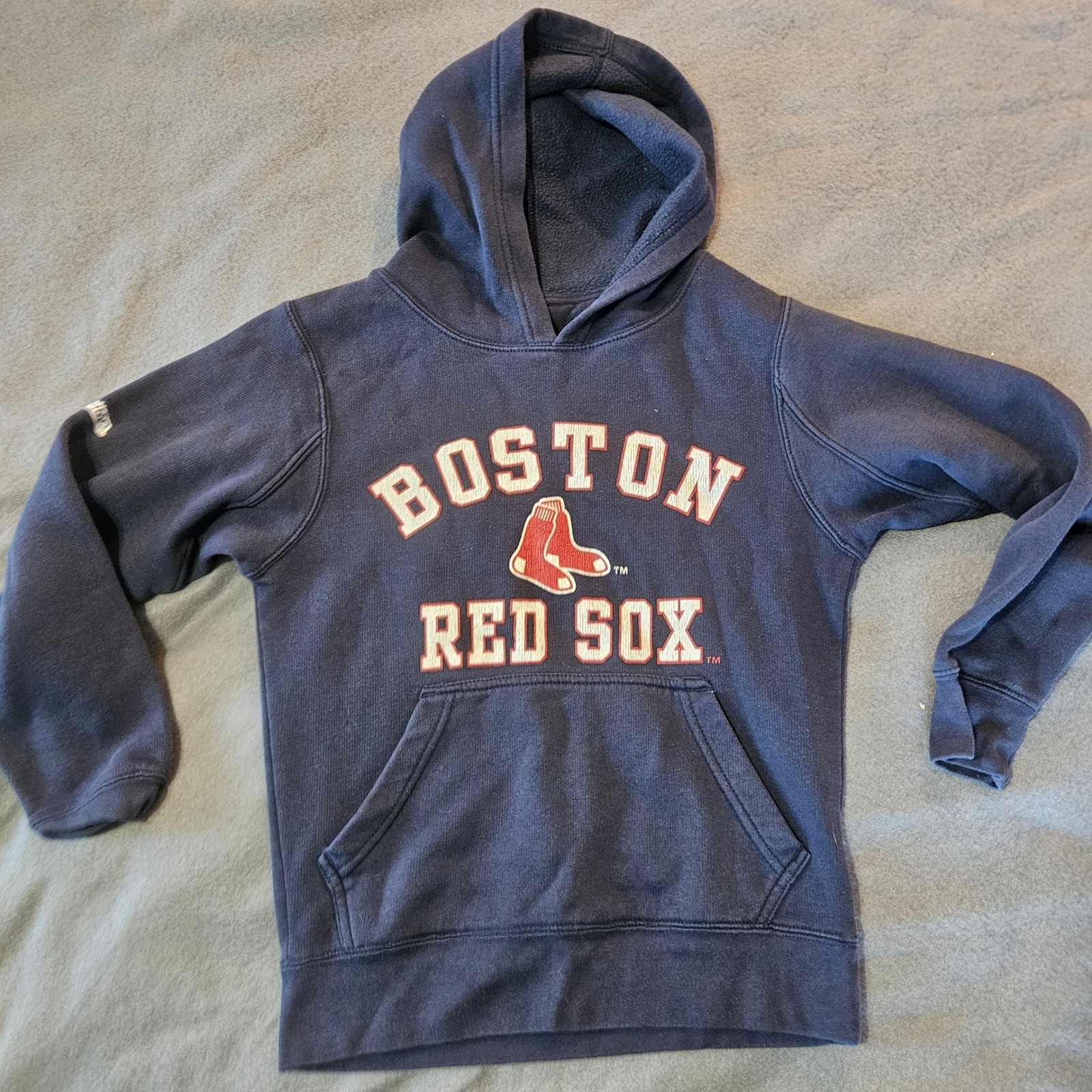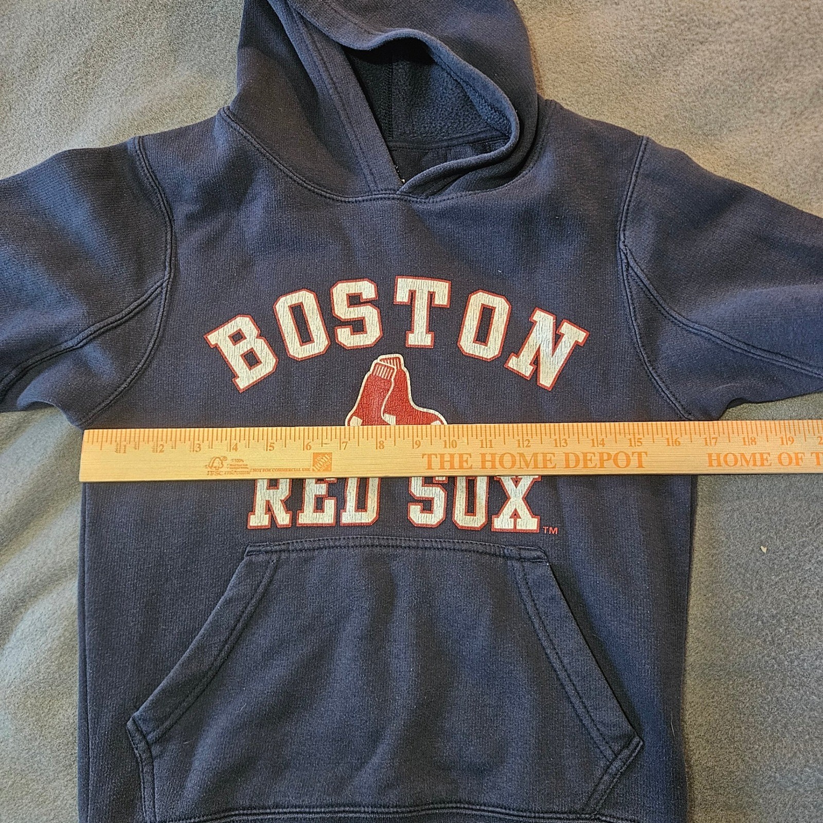 Show your team spirit with this classic Boston Red Sox hoodie. The iconic "BOSTON RED SOX" graphic boldly adorns the front, celebrating your love for America's favorite pastime. A cozy front pocket offers a warm place for little hands, while the attached hood provides extra comfort. Perfect for game days at Fenway Park, casual wear, or just lounging around, this hoodie is a must-have for any young fan.Measurements:• Chest (pit to pit): 16 in• Length (shoulder to hem): 20 in• Sleeve length (shoulder to cuff): 17 inStyle: PulloverDepartment: Unisex KidsType: HoodieClosure: PulloverFabric Type: Blended FabricFeatures: Hooded, Graphic PrintTheme: State, City, Travel & Places, School, BandMaterial: Polyester BlendPerformance/Activity: BaseballAccents: LogoSleeve Length: Long SleeveNeckline: Crew NeckPattern: SolidKeywords: Boston Red Sox, MLB, Youth Hoodie, Baseball Sweatshirt, Kids Apparel, Team Spirit, Sports Fan Gear, Comfortable, Casual Wear, Game Day Outfit, Navy Blue, Pullover