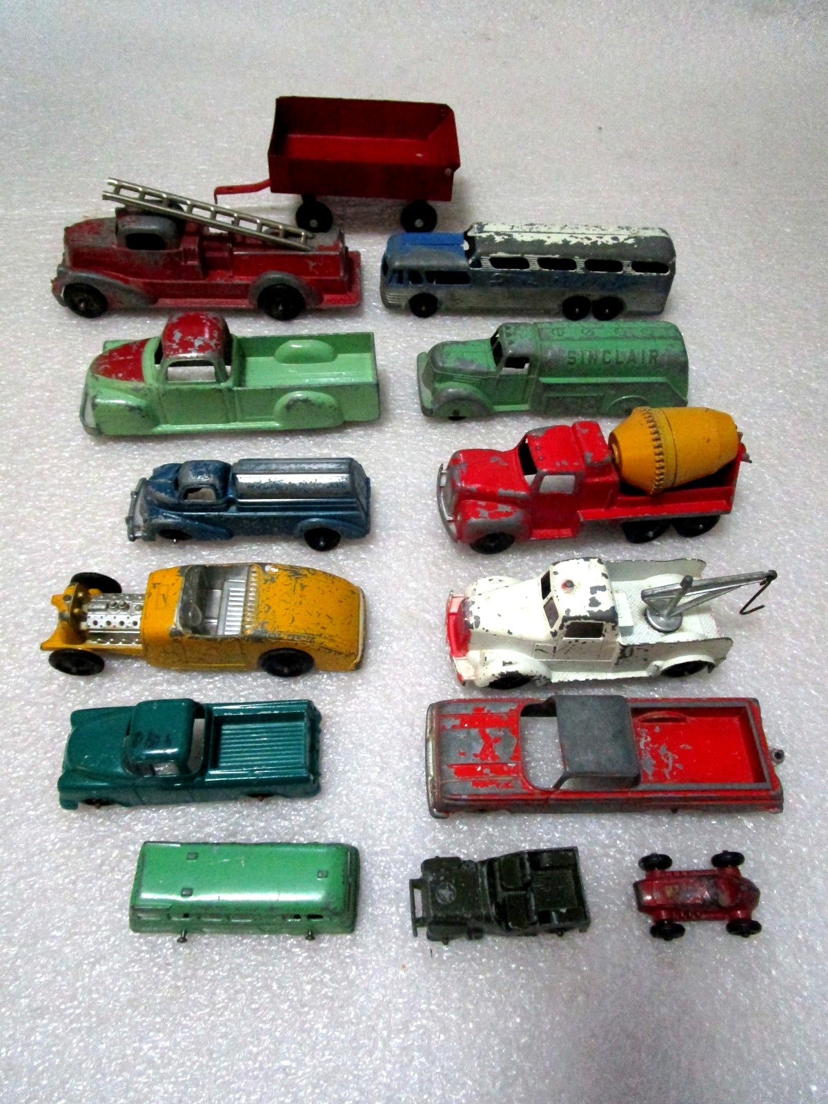 Lot of 14 Vintage Cars and Trucks - Found as cleared the family hP-10200ome over 45 years ago and stored since.All are solid and have all wheels. Check the photos as the paint has suffered the most from years of use and then being stored since the family home was sold in the '80's. Will measure and note any major issues and manufacturers to help identify.7 TootsieToy: Sinclair Gas Truck 6" Green Ertl Farm Trailer - 6 1/2" Cement Mixer Truck - P-10200 6" Hubley Kiddie Toy Fire Truck - 7 1/2" Tow Truck - 4 1/2" Mack Red Grill Original Excel Products Pickup Truck - 6 1/2" Green Pick-up Truck 5 1/2" Manoil 710 Gas Truck 4 1/2" Blue Pick-up Truck 4" Green Unbranded Greyhound Scenic Cruiser - 7" Bus - 3 1/2" Green Unbranded Hot Rod - 5 1/4" Marked Made in Chicago Jeep - 2 1/2" Unbranded Open Wheel Race Car - 1 3/4" Please check photos and ask any questions needed. As mentioned-all wheels included and most all have a good deal of paint loss.
