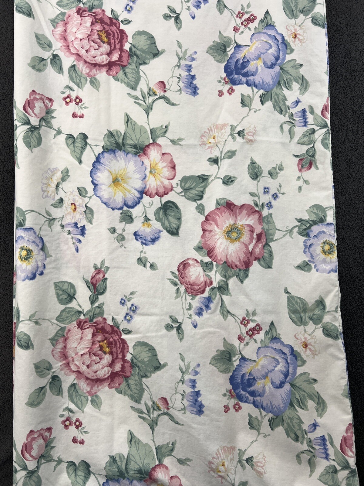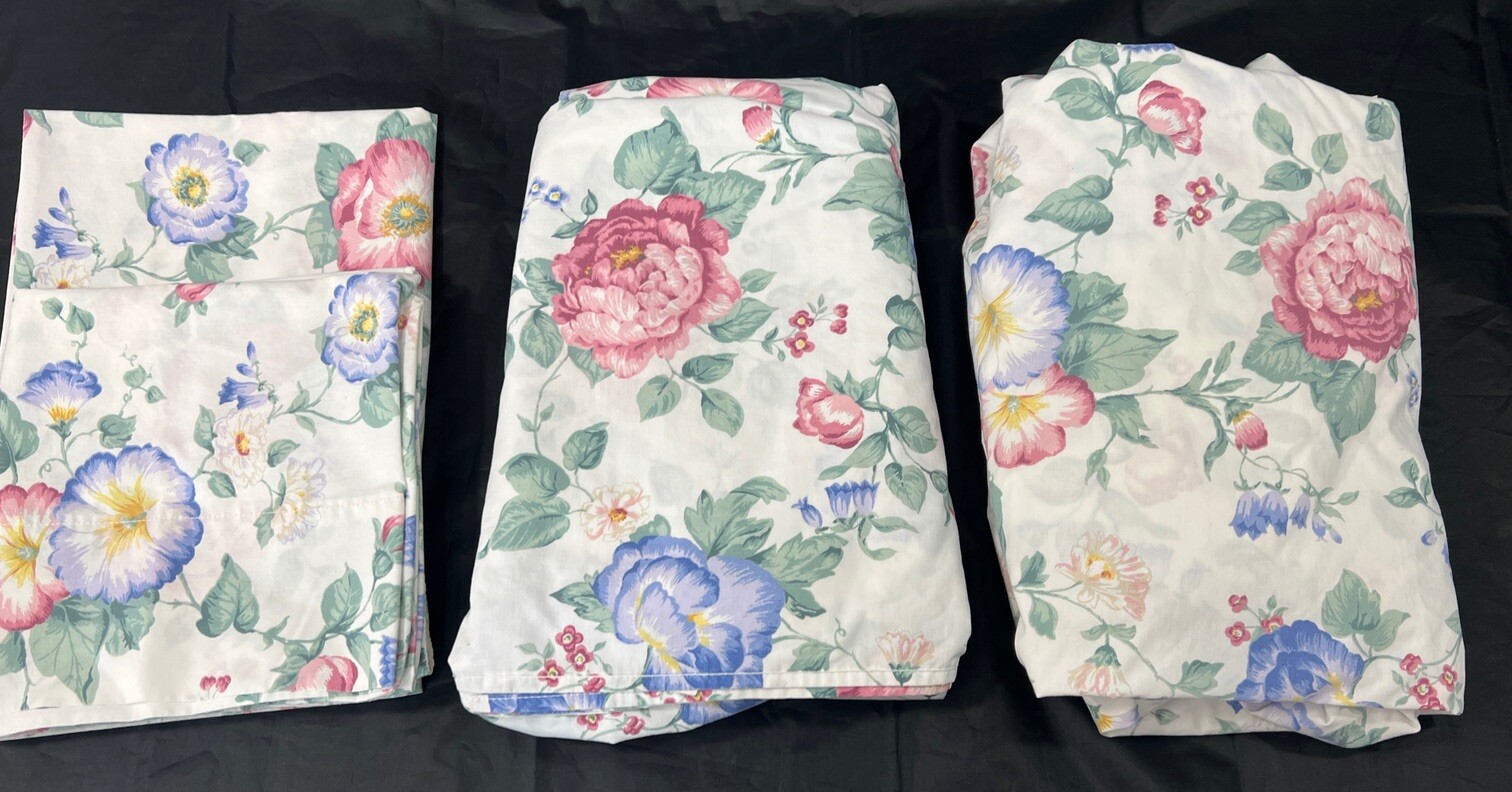 ITEM INFORMATION Era: 1990sBrand: Westpoint StevensMade in USAStyle: Gorgeous percale sheets, white cottage floral repeating print- Standard King Sheet Set 4 Pieces - Flat, Fitted, 2 Standard Pillowcases, style is very similar to Ralph Lauren Floral Design home pieces. Chic shabby style.Color: White background with Multicolored Cottage Core Cabbage Rose Floral Print Size: King - 4 piece SetMaterials: Cotton/PolyesterApproximate Measurements: 102” X 108” Flat76” X 80” Fitted20” X 40” Pillowcases Condition: Preowned/Preloved Item, Very Good condition, no visible flaws, otherwise normal minor wear, cleaned with laundry sanitizer, no stains, no rips, no holes. Note: Elastic ends/corners are worn and it is recommended the fitted sheet should be used with sheet clips - still in good condition but some wear to elastic is present. SELLER POLICIES & DISCLAIMERS REVIEW ALL PHOTOSOur pictures/photos depict the actual condition of the item for sale, what is presented in the listing photos will be what you will receive, so please review ALL photos very carefully. Some listings will include stock photos if available and allowed to further describe the item for sale. We highly recommend viewing the item with the zoom photo feature to ensure you understand the actual condition. Colors often appear different on all different types of phones and computer screens. MEASUREMENTS We provide measurements so you can compare them to something you already own to help ensure the item for sale will meet your fit requirements. Please kindly use them!OUR ENVIRONMENT All items are tested, cleaned, sanitized and stored before shipping in a smoke-free, pet-free, pest-free, clean environment. QUESTIONSAll questions are welcome! Please feel free to ask all your questions before, during and after the sale! We are here to help you have an exceptional buying experience!SHIPPING POLICY We ship fast - same or next business day - and take care in preparing, processing and shipping our items to you. We also use the eBay Global / International Shipping Program for our International Buyers.We generally ship our items with USPS, heavier items are shipped FEDEX or UPS. We cannot predict delays that happen after the shipping entity takes control of the item. We provide all buyers with a tracking number for all items shipped, so everyone knows where items are in the process. Free shipping, when offered, only applies to buyers in the US Lower 48 states. RETURNS We accept returns within 30 days of purchase. All returns MUST be Returned in the exact same condition as sold. NOTE: Items sold as new/New with Tags that are returned worn or with tags removed will be subject to a 25% Restocking Fee. OFFERS AND BUY IT NOWOffers are always welcome! Please do not make offers or select Buy It Now if you are unsure or do not intend to follow through with the sale. **We are a very small business, we are human and sometimes honest mistakes are made, and are NOT intentional, with no intent to harm or defraud.