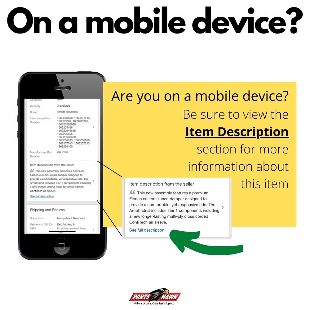 size of your item, it could be shipped with a truck carrier and will require you to be present at time of delivery. Please feel free to reach out to us and we will provide additional details. I have special delivery instructions (i.e. Leave by back door, leave with neighbor, place in the planter on the left of my garage, etc.) We recommend leaving a note for the carrier on the door nearest to the street as we do not have a way to communicate those requests for you. Why did my item ship from a different location? Many parts are stocked in more than one warehouse location. As a result your order may ship from a location other than the location shown in the listing. In most cases the shipping location will be closer to delivery address as we always try to ship from the closest warehouse to minimize transit times. In some circumstances intraday sales and other inventory changes may result in your item being shipped from a location further from your delivery address. Do I have to be there to sign for my package? If your order is over $250 there is a possibility it was shipped with a signature required option. The easiest way to check is to locate the tracking number for your order and open on the carrier’s website. There is no additional cost to you for this service. Can I pickup my part/order from your warehouse? Sorry, we do not offer the pickup in warehouse option as our warehouses do not have public access How do I know if this part will fit my vehicle? Check the vehicle compatibility guide above or just reach out to us. Updated 10.19.2023