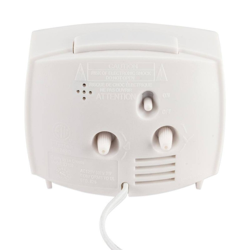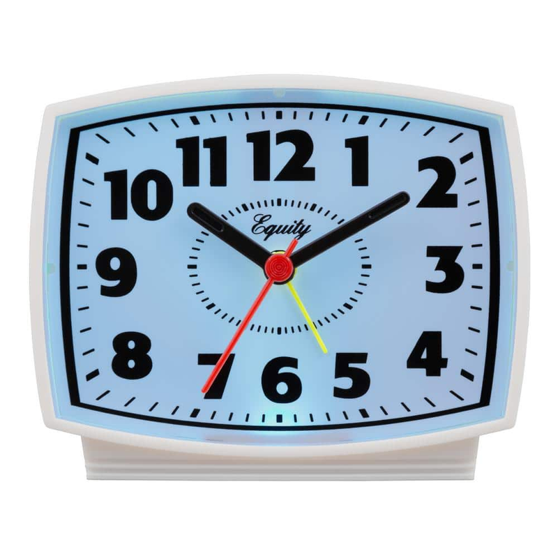 Equity by La Crosse 33100 Electric Silent Analog Alarm Clock - White Quartz movement gives a precise reading and is maintenance-freeWhite dial with black hands beautifully complement each otherFeatures a button at the top for quick shut off The Equity by La Crosse 33100 Electric Analog Alarm Clock is a simple solution for keeping up with the time. It is easy for most eyes to see, because of the large black numbers on the face. This plastic alarm clock is designed with black lines, so the seconds between numbers can be calculated quickly. It features a classic design, with quiet hand sweep quartz movement, that was built for practicality and function. This Equity by La Crosse alarm clock utilizes a loud beeping sound that will effectively pull a heavy sleeper out of the bed. The snooze feature allows for a little more sleep, but still with the security of knowing the clock will go off again. It is designed with a lighted backlight dial that allows for easy nighttime visibility and newly added adjustable dimmable wheel. No batteries are required, as this clock is powered by electricity. Equity by La Crosse 33100 Electric Analog Alarm Clock has a red second hand that stands out from the face.Blue backlight with bold white dialSilent sweeping hand movementTop snooze button (snooze duration of 4 minutes)Adjustable dial for backlight brightness (dimmer wheel located on bottom of clock)Plug-in style alarm; 5V power cord (no batteries needed) Alarm Yes Batteries Required Batteries Not Required Clock Display Type Analog Clock Face