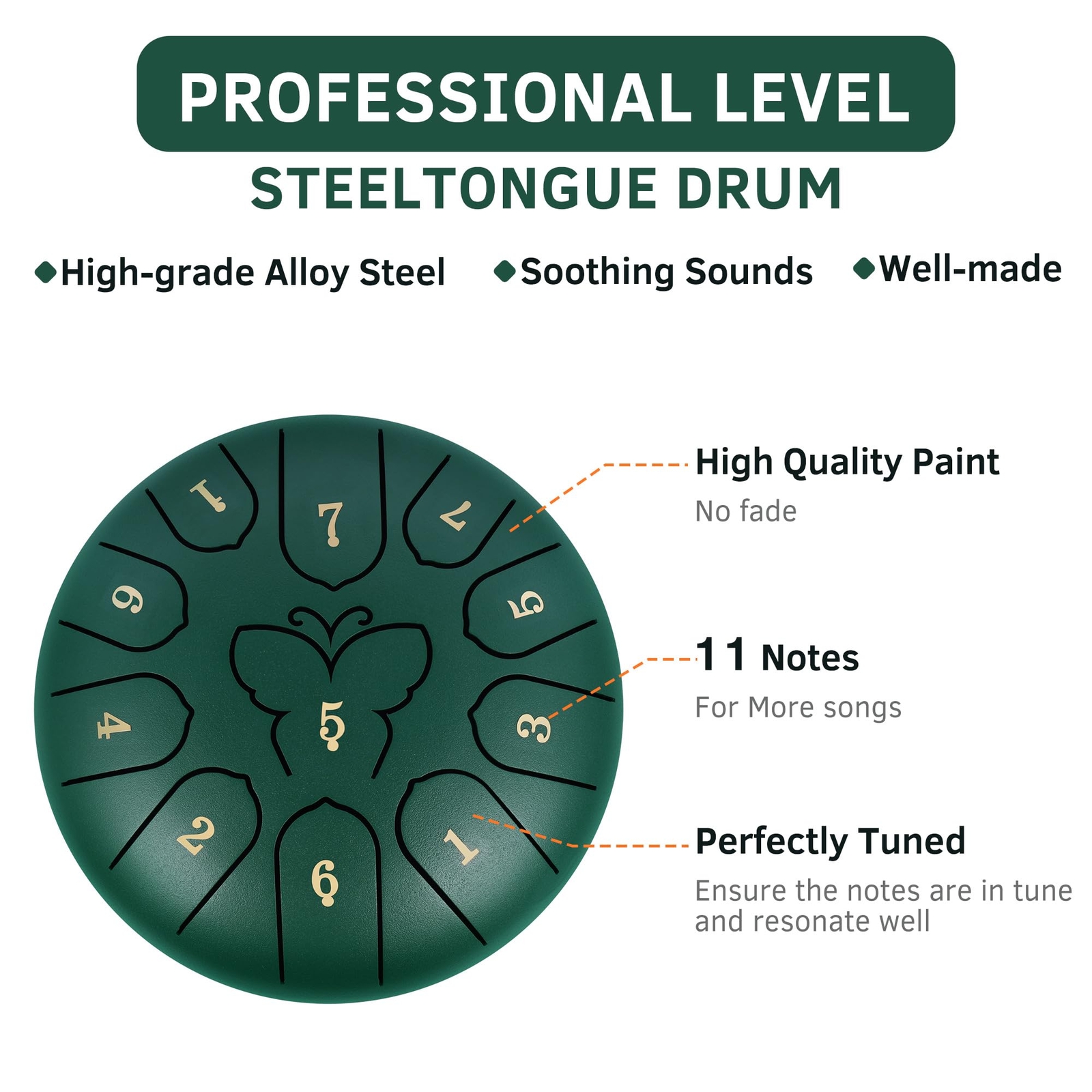 Soulful Sound: 11 Notes steel tongue drum creates an ethereal, Buddha-like sound that purifies the mind and soul. Its calming tones provide inner peace and relaxation, helping relieve stress and promote joy.Unique Music Instruments: 11 notes with a wider range and clearer sound crafted from high-alloy steel for superior corrosion and heat resistance. Hand-modulated with precision for stable, crisp, and beautiful tones. A high-end, durable percussion instrument.Versatile and Stylish: Updated steel tongue drum ideal for relaxation and stress relief. Perfect for music education, yoga, meditation, Zen sessions, spiritual rehabilitation, dreams, prayer, and concert accompaniment. Its elegant design and rich sound make it a favorite.Easy to Play: Featuring 11 tones for a wide sound range, this steel tongue drum is perfect for beginners with music book. Play with mallets or hands, and learn easily with included notes. Comes with a portable carry bag.Ideal Christmas Gifts: Perfect gifts for family and friends. This hand drum promotes creativity, hearing, and memory development, boosting confidence and patience. A unique gift for birthdays or special occasions for christmas gifts.