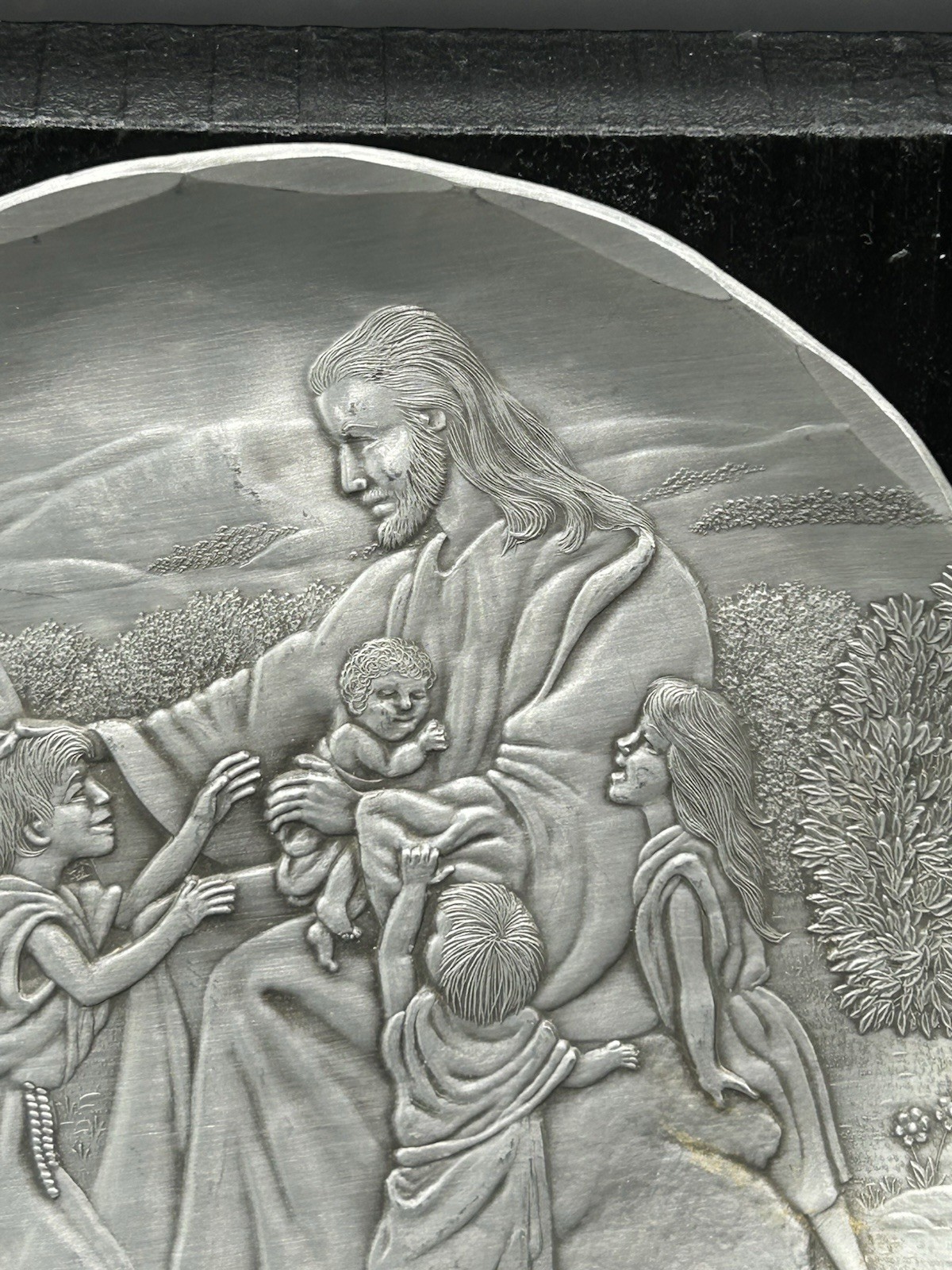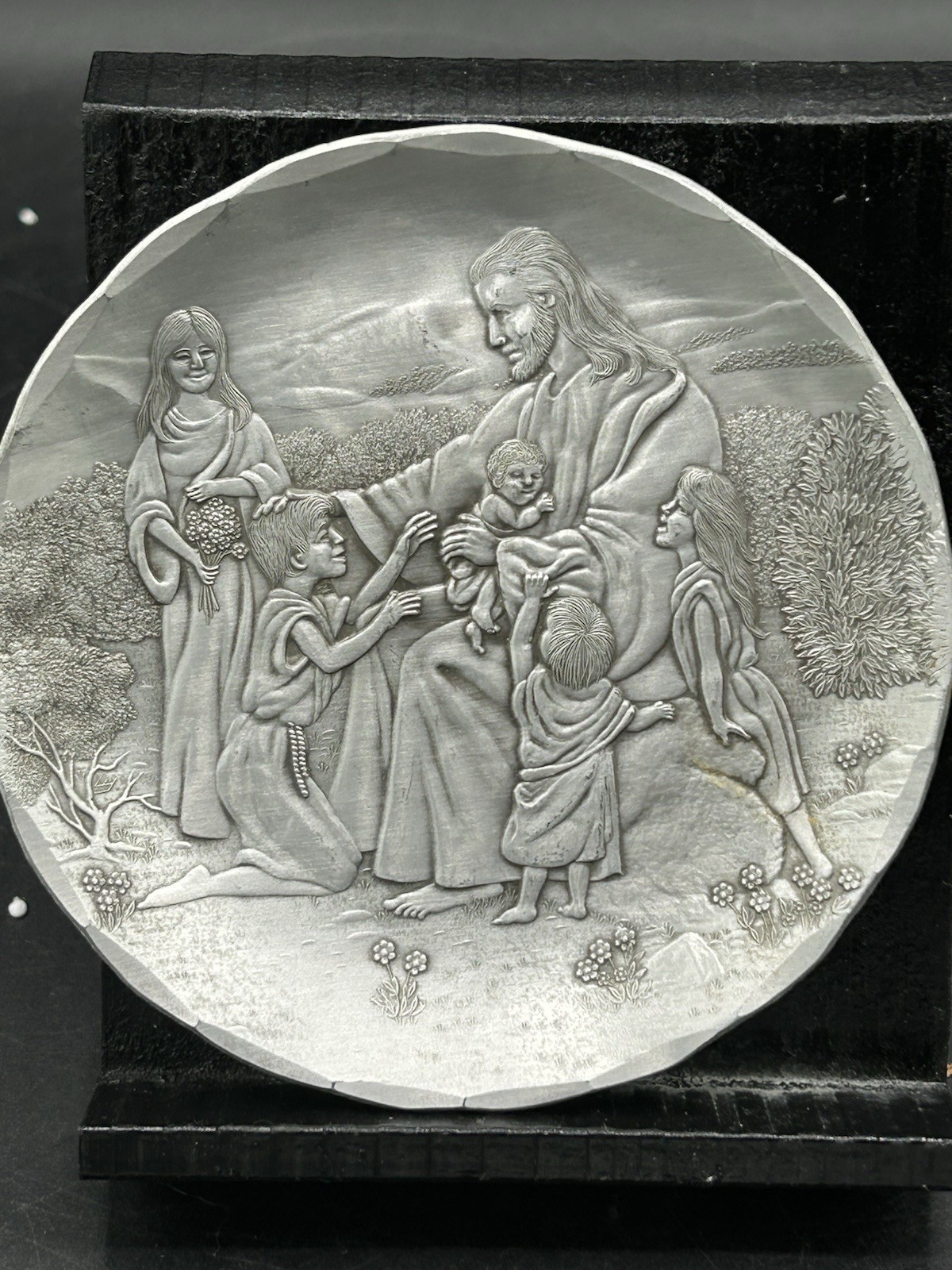 The Vintage Wendell August Forge Jesus & Children Plate is a 4" handmade aluminum plate featuring a religious image of Jesus and children. Made in the United States by Wendell August Forge, this collectible piece showcases the craftsmanship and quality of American metalware. With its unique design and historical significance, this plate would make a meaningful addition to any collection or a thoughtful gift for someone who appreciates religious artistry.Feel free to message me with any questions