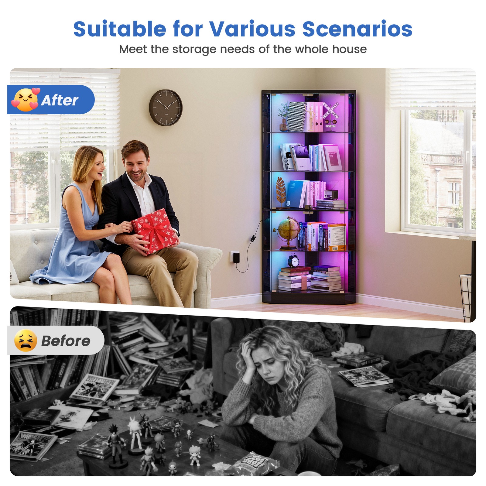 accessories are labeled, it is recommended that you follow each step in the instructions! If there are any issues with missing items or damaged parts, just click "Contact Seller" to get a satisfactory solution.✨ 【Ideal Holiday Gift】You can give this Bookcase to your husband, boyfriend, son or yourself on holidays/anniversaries, it is an ideal gift for various occasions such as Valentine's Day, Father's Day, Christmas, boyfriend's birthday or housewarming celebration.✨ 【RGB Magic Light】Our glass display cabinet is equipped with 7 static lights and 5 dynamic dancing light modes, adding a modern touch to your living space. At the same time, you can touch the switch to change the