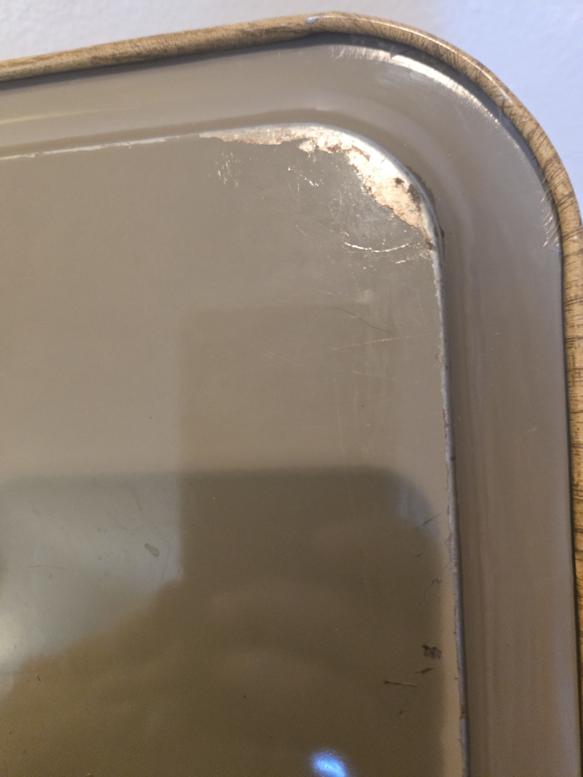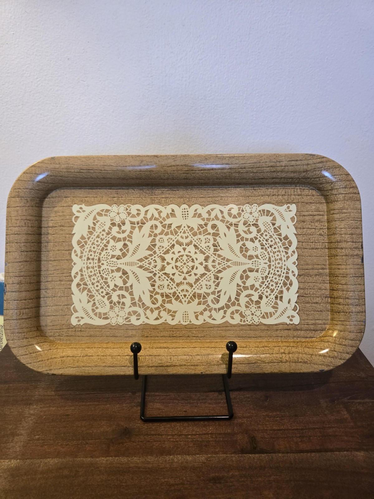 Lot of 7 Vintage Metal Serving Trays Woodgrain Lace Design 14.25x8.75 Specs