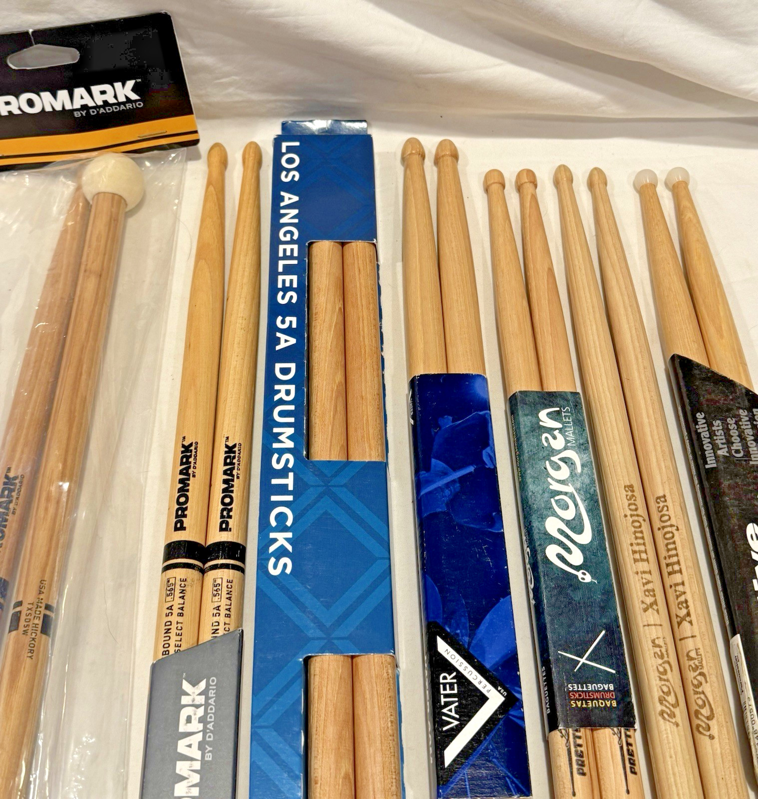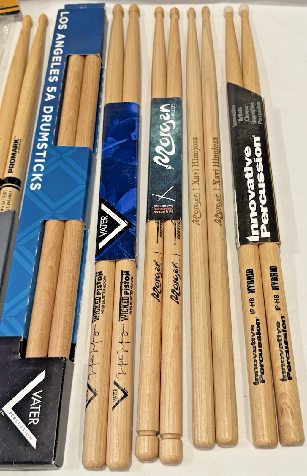 Here you have a great bundle of 7 pairs of drumsticks including a pair of multi-percussion sticks/mallets. All of these sticks are mint and unused. See pictures for specific condition and details. The lot includes:1 pair ProMark Rebound 5A Select Balance, hickory wood tip1 pair Vater Los Angeles 5A hickory, wood tip1 pair Innovative Percussion IP-HB Combo Hybrid, hickory, nylon tip1 pair Vater Mike Mangini Signature Wicked Piston, hickory, wood tip1 pair Morgan Mallets (the Vic Firth of Spain) Xavi Hinojosa Signature Jazz, hickory, wood tip1 pair Morgan Mallets Luis Garcia Signature, hickory wood tip with special butt end1 pair Promark TXSD5W Light Multi Percussion Stick, wood tip, felt mallet head, hickoryA special note about the Morgan Mallet sticks. These sticks are beautifully crafted with perfect balance and feel, in Spain. Morgan is not well known in the US, but those that know understand the high level of materials and craftsmanship that go into all of their sticks and mallets. They are the gems in this bundle and very hard to get in the US!