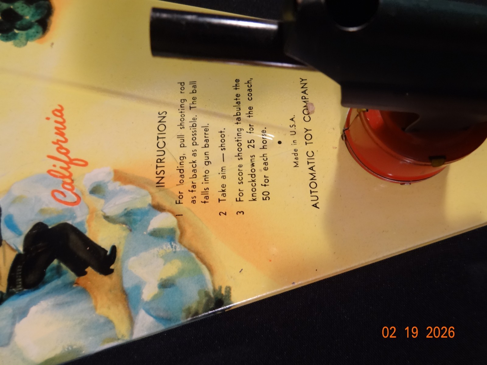The Automatic Toy Co. Hoppy Shooting Gallery with Box is a vintage toy that would be perfect for collectors of cowboy and western memorabilia. This toy features a unique shooting gallery aspect, making it a fun and interactive addition to any collection. With its nostalgic charm and vintage appeal, this toy is sure to delight both kids and adults alike.Tin Litho with box. Not working. Box is rough. Item sold "as is." Email any questions. Thanks for looking! It is my wish that all buyers are happy with their purchases. If you are by chance unhappy, please let me know and I will try and make things right. In return, please leave positive feedback along with 5 star ratings on the "Detailed Sellers Rating" (DSR). Respectfully, if you are a buyer that is generally inclined to not give 5 star DSR ratings, please email before participating in this auction. Otherwise, thank you for your interest and I appreciate your bids.