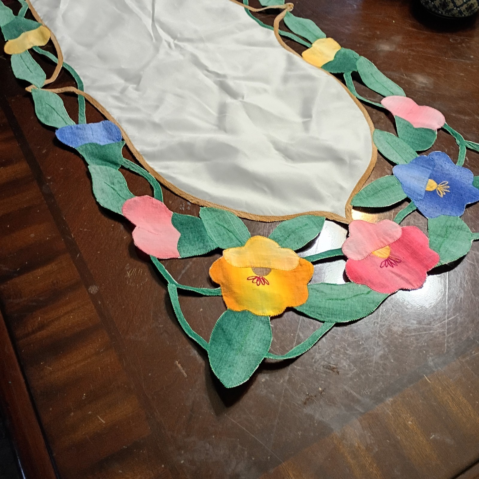 This product is a colorful floral patterned table runner made of cloth, measuring 35" in length and 14" in width. The cutting work edges add a decorative touch, making it a stylish addition to any dining table. Perfect for adding a touch of nature-inspired charm to your home decor, this table runner is both functional and aesthetically pleasing.