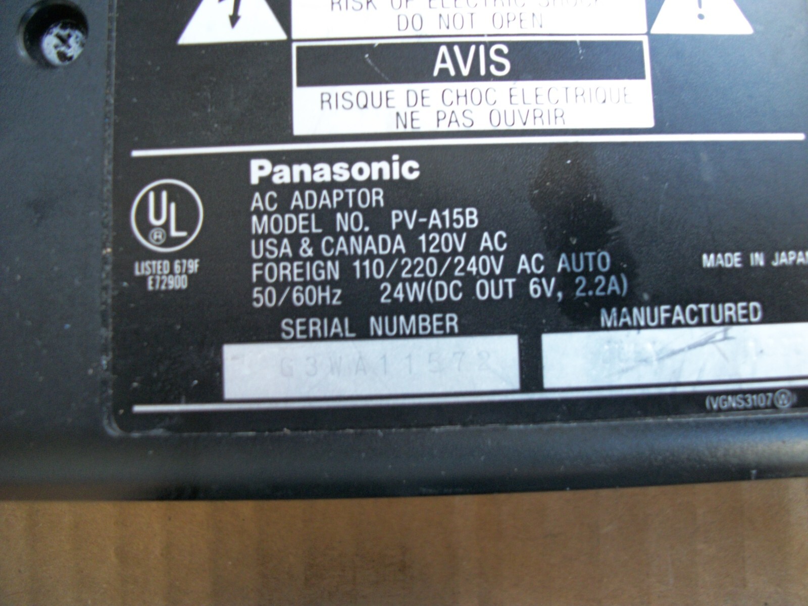 Panasonic PV-A15B Camcorder Battery Charger/Power Supply With Adaptor Cable Specs