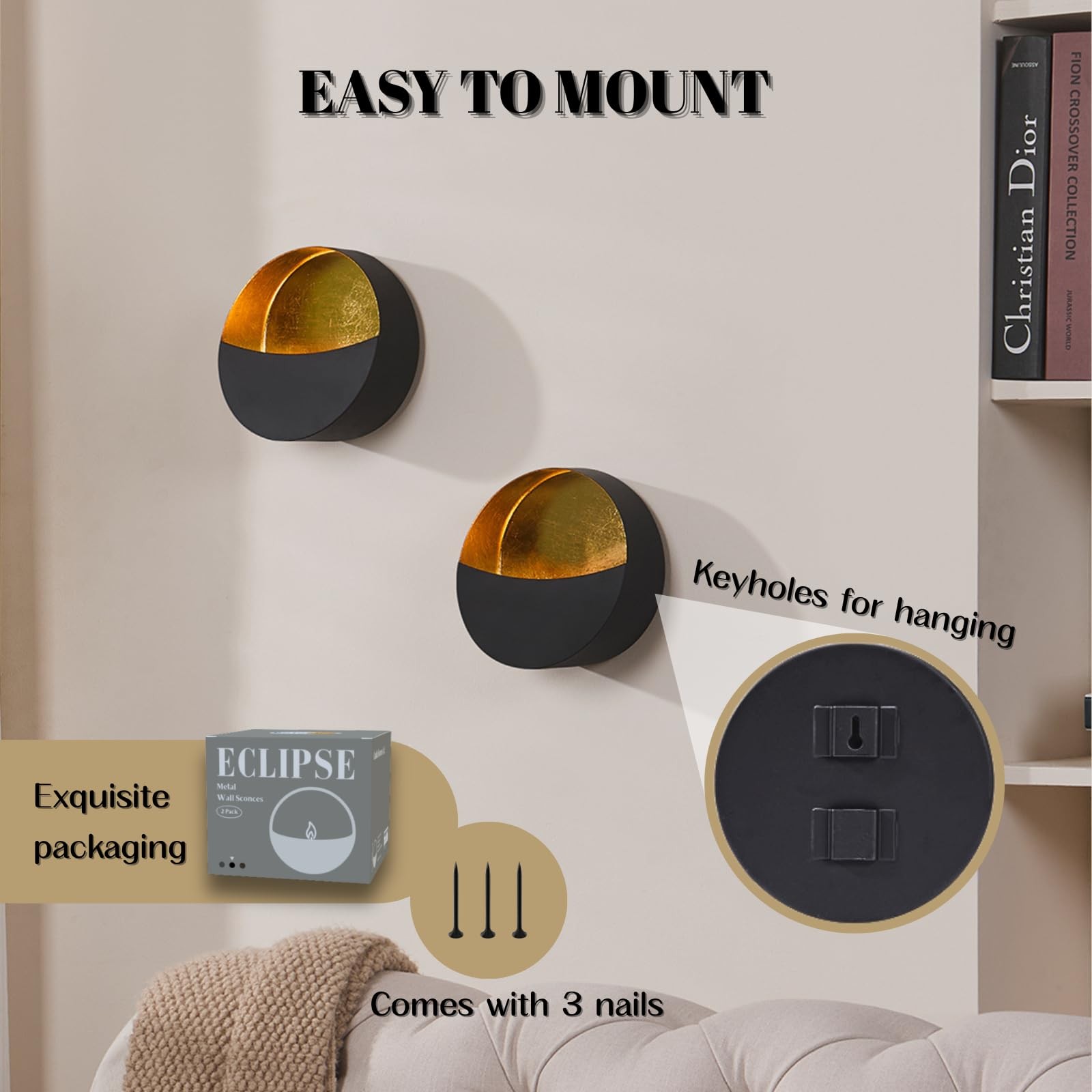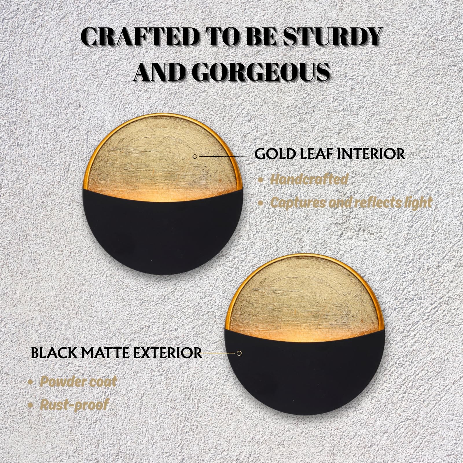 Black Wall Candle Holder Set of 2 with Gold Leaf Interior, Metal Wall Candle Sconces, Vintage Style Wall Decor for Living Room, Bedroom, and Dining RoomTimeless Vintage Design: This wall candle holder set features a sophisticated black exterior with a luxurious gold leaf interior, creating a perfect blend of vintage charm and modern elegance.Premium Craftsmanship: Each candle sconce is meticulously crafted with high-quality metal and finished with a gold leaf interior, put in a tea light candle to add a touch of opulence to your home decor.Versatile Placement: Ideal for enhancing the ambiance of your living room, bedroom, dining room, or hallway, these candle holders create a warm and inviting atmosphere for any occasion.Easy to Install: The set comes with 3 nails. Designed for convenience, the wall-mounted design allows for easy installation, making it a hassle-free addition to your home decor.Perfect Gift Idea: With its elegant and timeless design, this candle holder set makes a thoughtful and stylish gift for housewarmings, weddings, or any special occasion.