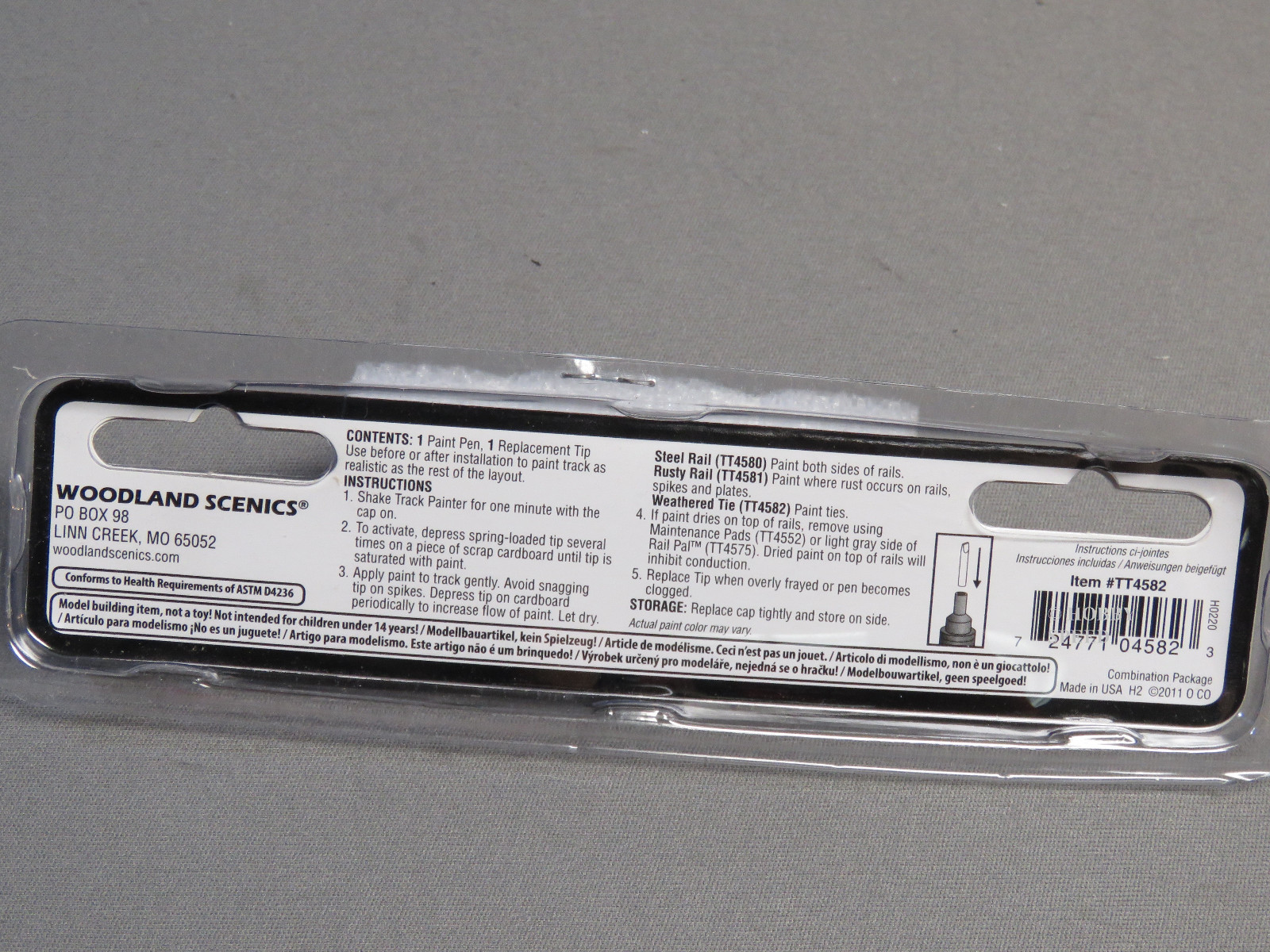 Woodland Scenics: TT4582 WDS4582 Normal 0 Track Painter - Weathered Tie TT4582 Paint ties a realistic matte finish. Transform your track quickly and easily to look as realistic as the rest of your layout. Use before or after installation to paint metal or plastic. Works for all scales. Includes and extra tip. 1 painter per package. 10mL (0.33 fl oz)Use before or after installation to paint track as realistic as the rest of the layout. INSTRUCTIONS1. Shake Track Painter for one minute with the cap on.2. To activate, depress spring-loaded tip several times on a piece of scrap cardboard until tip is saturated with paint. 3. Apply paint and let dry. Steel Rail (TT4580)Paint both sides of rails. Rusty Rail (TT4581)Paint where rust occurs on rails, spikes and plates. Weathered Tie (TT4582)Paint ties.4. If paint dries on top of rails, remove using Maintenance Pads (TT4552) or light gray side of Rail Pal™ (TT4575). Dried paint on top of rails will inhibit conduction. 5. Replace Tip when overly frayed or pen becomes clogged.STORAGE: Replace cap tightly and store on side Will work your Lionel, Kline, MTH, Weaver, MDK, Bachmann, Atlas or any gauge track. Check out our eBay Store for more Woodland, Testors, Lionel, MTH, Bachmann, Atlas and much more. We combine shipping on multiple items!! Insurance is Included in S&H Price Please wait for our invoice before payment is sent. We offer discount shipping on multiple items but can ONLY combine shipping if you wait until you are done bidding and receive our final invoice to pay. All items must be paid within 7 days. For Great Customer Service click the "Contact seller" link in our listing! Shipping price is for Domestic USA only. Hawaii, Alaska, APO's, and Puerto Rico may incur additional S&H International: We Ship Worldwide HOBBYSPEED Value Added Authorized Lionel Dealer INDIANA, PA UNITED STATES OF AMERICA