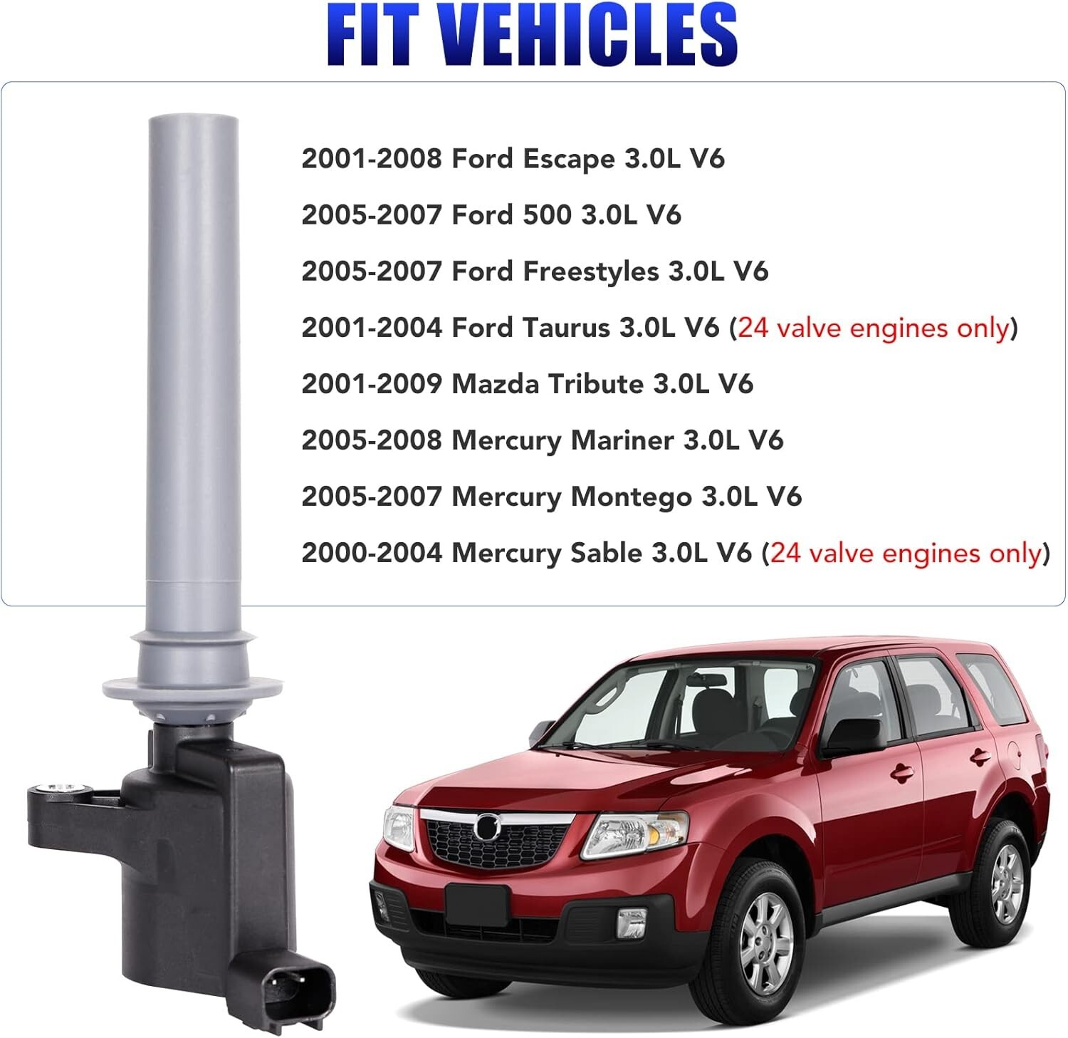 Set of 6 Ignition Coil Pack Spark Plugs for 3.0L 2001-2008 Ford Escape FreestyleAbout this itemCompatibility: Ignition Coil Pack and Spark Plugs for 2001 2002 2003 2004 2005 2006 2007 2008 Ford Escape 3.0 V6 | 2001-2009 Mazda Tribute 3.0 V6 | 2005-2007 Ford Freestyles 3.0L V6 | 2001-2004 Ford Taurus 3.0 V6 | 2005-2007 Ford 500 3.0 V6Compatibility: Ignition Coil Pack and Spark Plugs for 2005-2008 Mercury Mariner 3.0L V6 | 2005-2007 Mercury Montego 3.0L V6 | 2000-2004 Mercury Sable 3.0 V6Premium Performance: LCWRGS coils and spark plugs are built to achieve or exceed OE