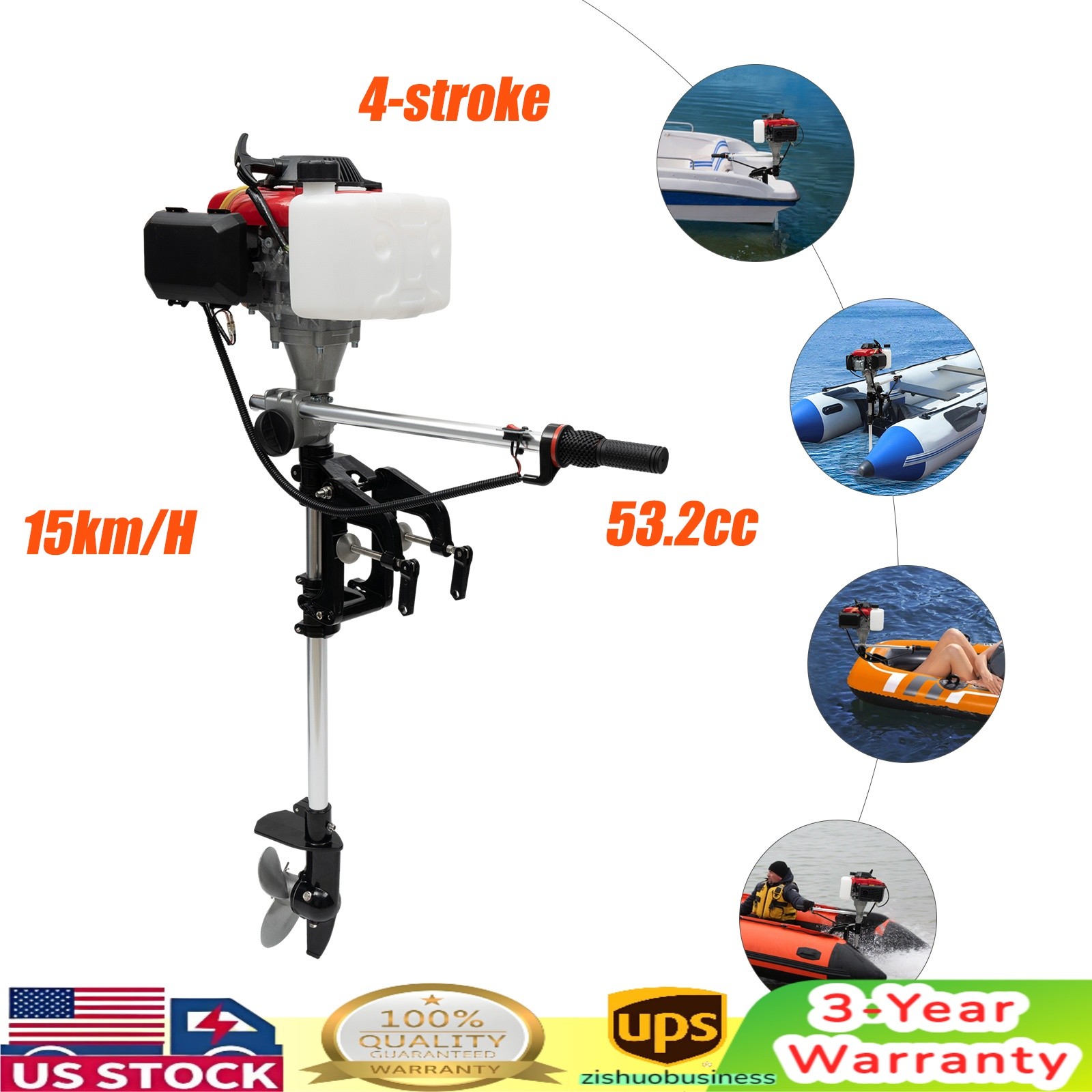 HANGKAI 4HP 4Stroke Heavy Duty Outboard Motor Boat Engine W/Air Cooling SystemOutboard Motor 4 Stroke Inflatable Fishing Boat Engine (4-stroke 4P)Outboard Motor, 4 Stroke 4HP Outboard Fishing Boat Motor Engine With Air Cooling for Inflatable Boat Kayak Canoe SailboatDescriptionDo you like fishing on the river? Do you want to go boating with your family? But are you worried about the manual boating is too tired? With our fishing boat engine, you don't have to worry about this problem. This engine has sufficient power and can drive the boat at a fast speed. The four-stroke 1.6kw fishing boat engine is suitable for all kinds of small boats of 7.5-16.4ft, such as rubber boats, fishing boats, wooden boats, etc.Key FeaturesGreat Durability: This bracket of the outboard engine is made of sturdy and durable aluminum and plastisol. And the engine is covered by a plastic housing, which is waterproof. So it has a long service life, and you can use it with confidence.Reliable and Safe: It uses 4-stroke power and air-cooling technology to improve the reliability and safety of the entire machine. It even allows for smooth and safe steering.Speed Adjustable: There is a speed adjustment handle on this engine's control lever. The speed can be controlled by rotating the handle.Powerful Engine: The engine is a 4-stroke 1.6kw engine, so its power is very strong. Its speed can reach 15km/h. So the superpower engine makes it very time-saving and energy-saving. You can travel quickly through the river with it.Convenient Control Lever: This engine has a lever to control the direction within 360° and a handle on the lever to control the speed. It is convenient to control the running speed by adjusting the handle as well as controlling the running direction by adjusting the lever.Easy to Carry: The weight of this engine is only 5.8kg/12.8lbs. The weight of the bracket is 4.7kg/10.36lbs. So even if you put them together, they won't be very heavy. You can easily take the outboard engine outdoors to go fishing on the river.Large Capacity Fuel Tank: This engine is equipped with a 1.2L /0.32gal built-in fuel tank. The built-in fuel tank can make the boat move at high speed for about 2 hours with one filling. So you don't need to refill it frequently.Easy to Use: This engine has a hand-pull start. Pull the engine's switch and then open the handle speed switch, then the boat will move on the river. So it is very simple and convenient for you to use.Wide Applications: There are many uses for this outboard engine. You can use it for fishing on the river, water farming, river rescue, water excursions, flood relief, etc.Guaranteed Customer Service: We aim to provide quality products and services. If you have any problems, please feel free to contact us. We will reply and solve the problem for you as soon as possible.DetailsClamping Bolt: The fishing boat engine has a clamping bolt on the rod. It clamps the engine firmly on the boat. It is also very easy to install.Water Baffle: There is a water baffle above the propeller to prevent water from splashing onto the boat. So you don't have to worry about getting yourself wet with the splash.Anti-slip Throttle Handle: The throttle handle of this product is designed with an irregular shape, which is more non-slip, facilitating your daily use.Heat Dissipation Housing: There are many small holes in the engine's housing to help dissipate heat and prevent the engine from burning out after prolonged use. These heat dissipation holes extend the life of the engine.Three-Blade Plastisol Propeller: This bracket uses a three-blade propeller to replace the traditional manual boat propeller. This propeller has a fast speed and allows the boat to be driven quickly.ApplicationThe fishing boat engine is suitable for all kinds of small boats of 7.5-16.4ft, such as rubber boats, fishing boats, wooden boats, etc. You can use it for fishing on the river, water farming, river rescue, water excursions, flood relief, etc.SpecificationBracket: Material: Aluminium Rod, Plastisol Propeller Color: Black and Silver Drive Rod Length: 56cm/22.05inch Small Bracket Size: 19*8cm/7.48*3.15inch Control Lever Length: 53cm/20.87inch Package Size: 94*19*16cm/37.01*7.48*6.30inch Net Weight: 4.7kg/10.36lbs Gross Weight: 4.95kg/10.91lbsEngine: Color: Orange, Black, Silver Size: 26*22.5*29cm/10.24*8.86*11.42inch Engine Model: Four-stroke 144F Displacement: 53.2cc Air-cooling Mode: Forced Air-cooling Gasoline Volume: 1.2L /0.32gal Starting Method: Hand-pull Start Speed: 15km/h Steering: Handle Steering Fuel Consumption: 1-1.2 Hours/ One Tank of Gasoline Fuel Type: Gasoline Mounting Type: Engine Package Size:33.5*29.5*23.5cm/13.2*11.6*9.2inch Net Weight: 5.8kg/12.8lbs Gross Weight: 6kg/13.2lbsSize After Installation: 26*53*113cm/10.24*20.87*44.49inchInstallation InstructionInstallation Warning: Most boats are approved for a maximum power rating, which is shown on the boat's nameplate. Do not configure your boat with an outboard that exceeds this limit.Installation position: The center of the boat's bottomOutboard installation instructions:Select the outboard engine with corresponding