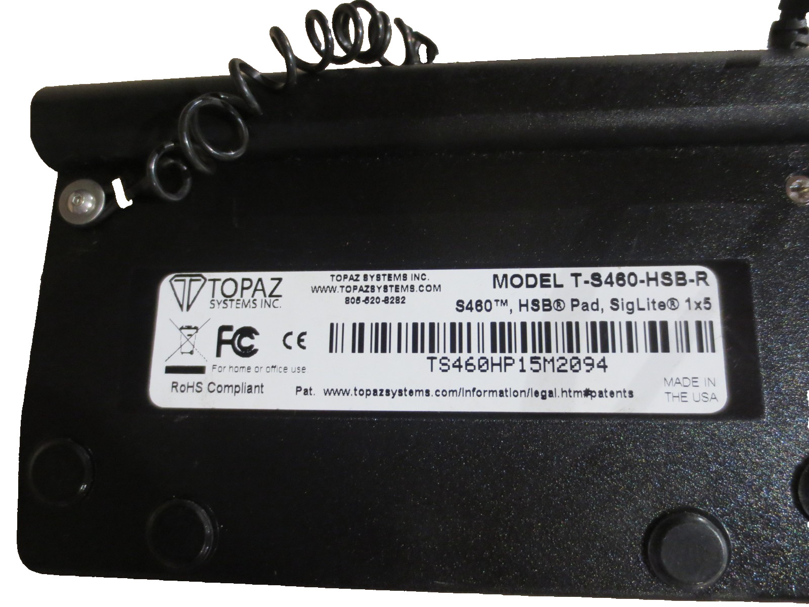 Topaz Systems T-S460-HSB-R Topaz SigLite Electronic SignatureITEM IS USED.ITEM MAY HAVE SIGNS OF COSMETIC WEAR DUE TO PRIOR USEITEM WILL NOT COME WITH ANY ACCESSORIES THAT ISN'T INCLUDED IN PICTURES. Please see pictures to verify.LOC:NNN20-3C.G30 DAY WARRANTYReturns will not be honored if the merchandise is altered in any manner; this includes showing signs of use. The merchandise must be returned in its original packaging.FEEDBACK Positive feedback from our customers is critical for the continued success of our business. Feedback from customers has a direct impact on our sales. Ultimately, by leaving positive feedback, you are having a positive effect on the sales of our products..NEW OR USED If for any reason you do not feel that you can provide positive feedback, please let us know in advance, so that we can try to SOLVE the problem prior to feedback and ratings being left.PAYMENTFor your convenience, credit cards and electronic checks are accepted through PayPal.Payment must be received and cleared prior to your merchandise being shipped.Payment is due at the time of purchase.SHIPPINGAll orders are mailed to the Buyer at the address that they have listed on eBay as their Shipping Address. If you would like your order shipped to a different destination, please update eBay with the correct shipping address prior to making your purchase.The Buyer is liable for all shipping and handling charges, eBay and merchant account fees, and re-stocking fees incurred on orders that are undeliverable to the address listed on eBay as the Buyer's Shipping Address.The Seller, at their discretion, may elect to use a shipping company other than the one indicated in the listing. The most common shipping companies used by this Seller are the USPS, FedEx.All shipments will receive a tracking number. The tracking number will be updated to eBay and PayPal by the Seller.We proudly support the men & women that serve to protect us, our country and our freedom. We are happy to ship our products to you or your loved ones at APO/FPO addresses.At this time we do not offer international shipping. International shipping includes all locations that are not within the USA.CONTACT USPlease do not hesitate to contact US should you have any questions. We will respond promptly to your inquiry.