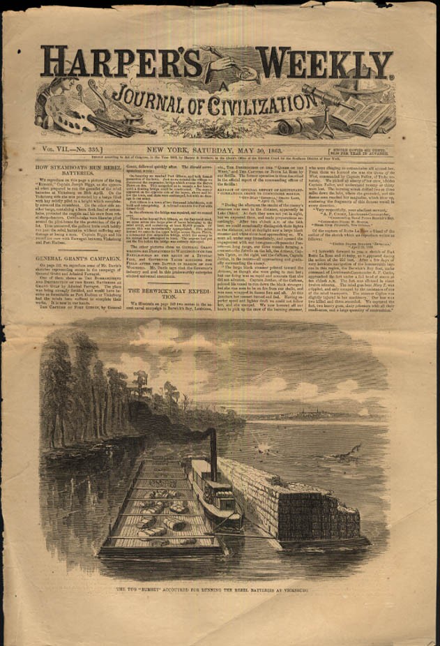 HARPER'S WEEKLY cover 5/30 1863 Tug Rumsey accoutered to run rebel batteries