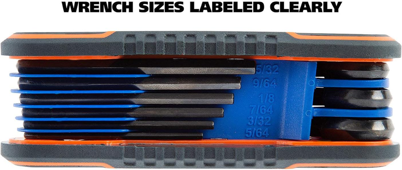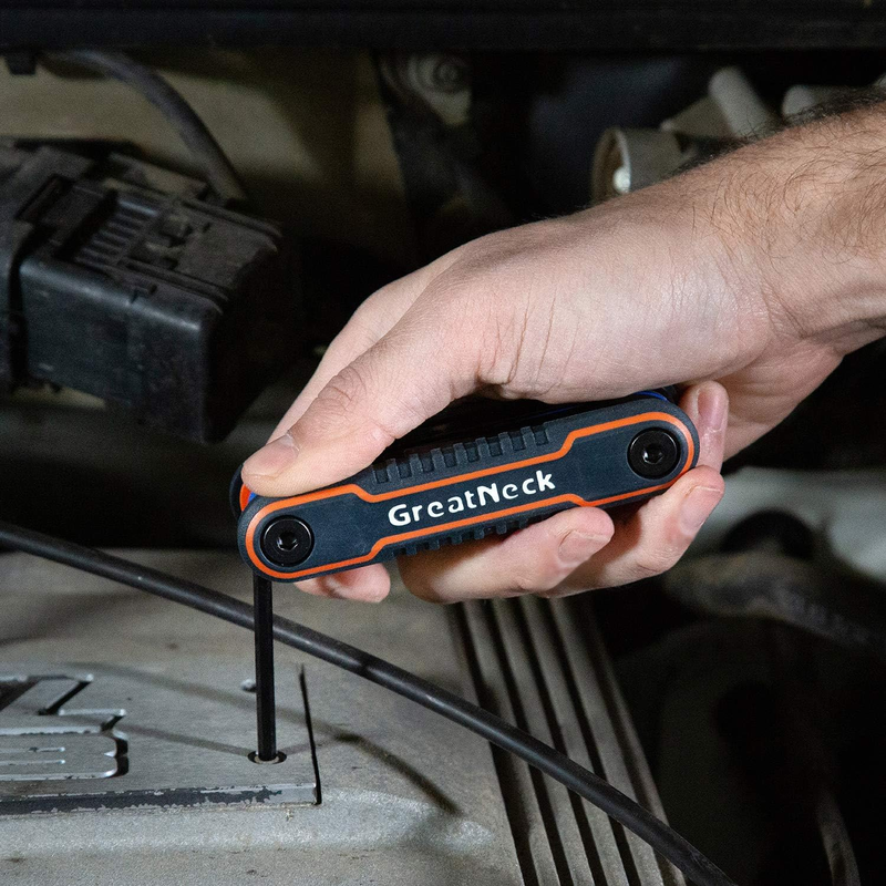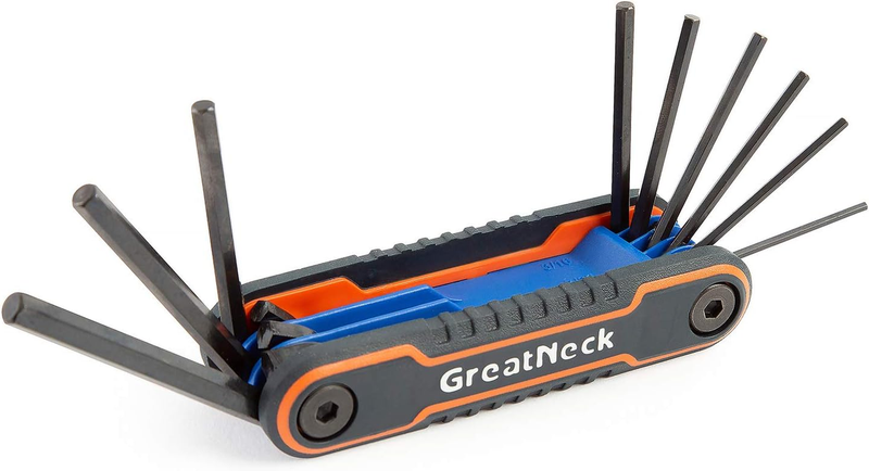 ADJUSTABLE FASTENERS: This folding Allen wrench set provides a perfect fit for bolts and screw heads; These Allen keys can be adjusted for more or less torque, and fit into tight spaces for more torque than straight hex keys provideCONVENIENT FEATURES: Our hex set includes clearly labeled wrench sizes and a color-coded body for easy identification; Hex wrench set makes it quick and simple to select the right hex tool for the jobDURABLE CONSTRUCTION: This Allen wrench hex set is constructed for longer life and extended rugged use; Hex keys set is made of hardened and tempered steel for strength and durability; Hex tool set keys resist rust and corrosionCOMFORTABLE TO USE: These hex key sets feature an ergonomic grip for steady and comfortable use; Hex set tools provide maximum comfort while completing repairs or maintenance work; Perfect for assembling itemsPRODUCT SPECIFICATIONS: Included Sizes: 5/64", 3/32", 7/64", 1/8", 9/64", 5/32", 3/16", 7/32", 1/4"; Ergonomic Grip; Hardened and Tempered CR-V Steel; Durable Composite Construction; Labeled Wrench Sizes; Color-Coded Body Great Neck 74208 FOLDING HEX KEY SET - SAE 9 PC