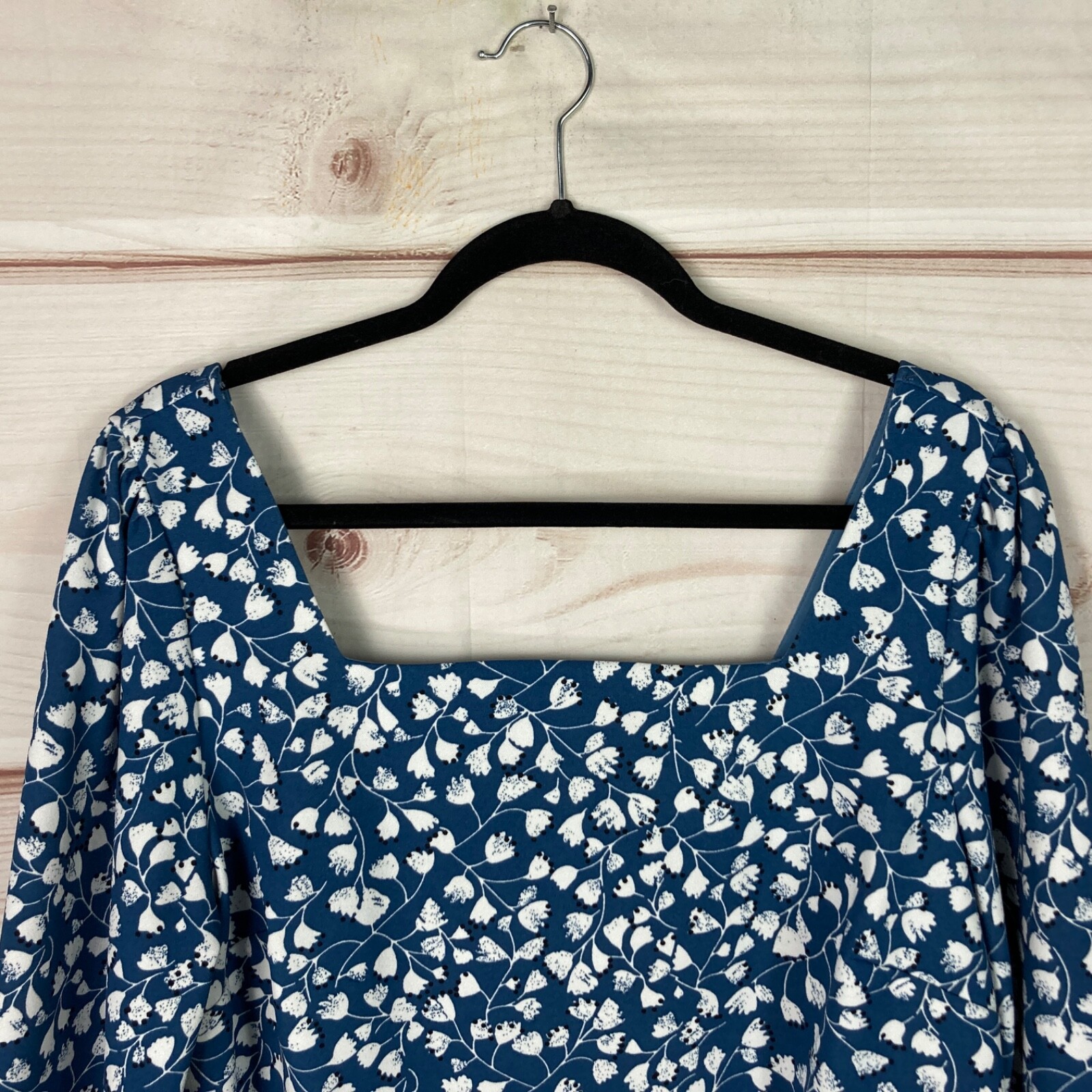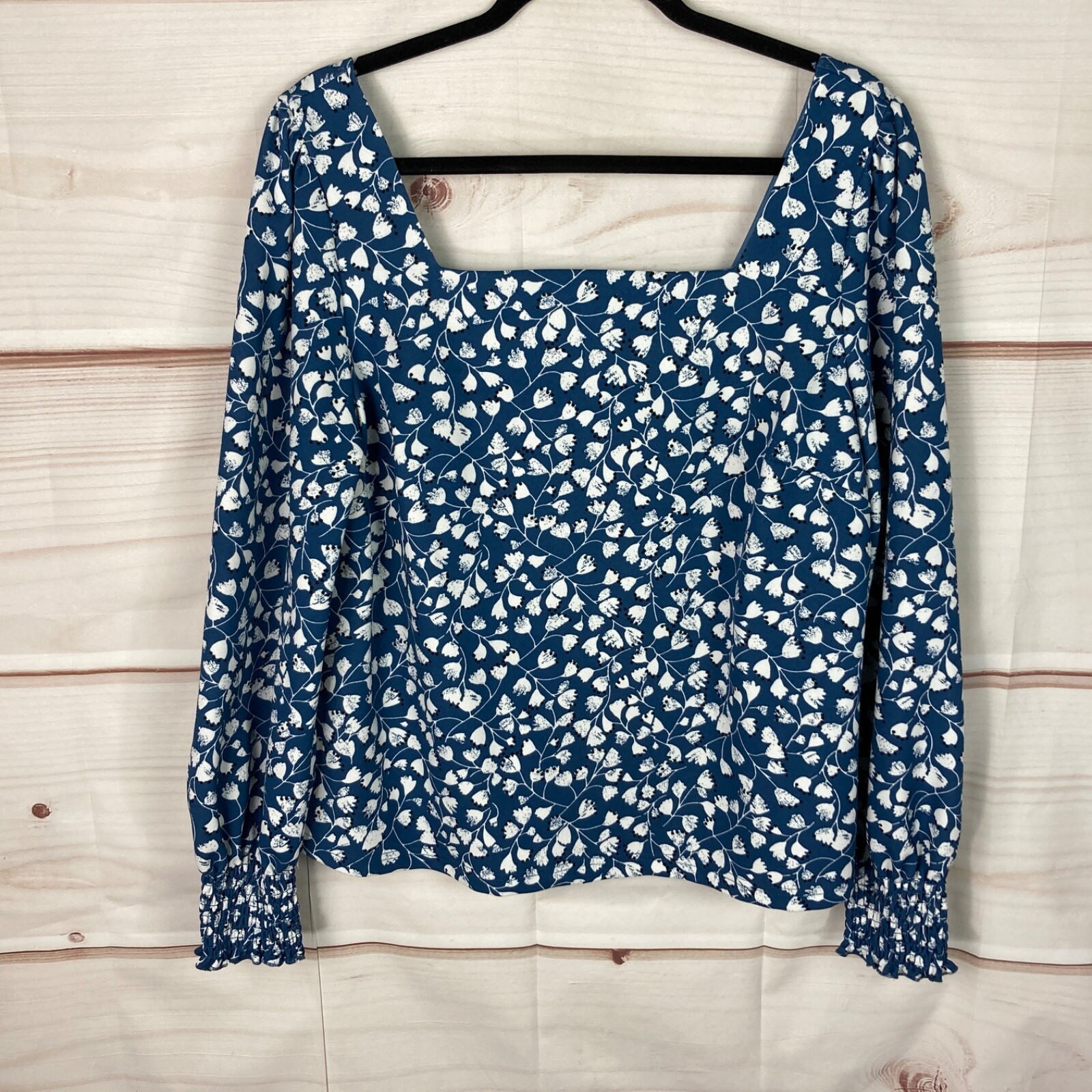 Melloday Top Womens L Blue Floral Blouse Square Neck Long Sleeve Smocked Cuff