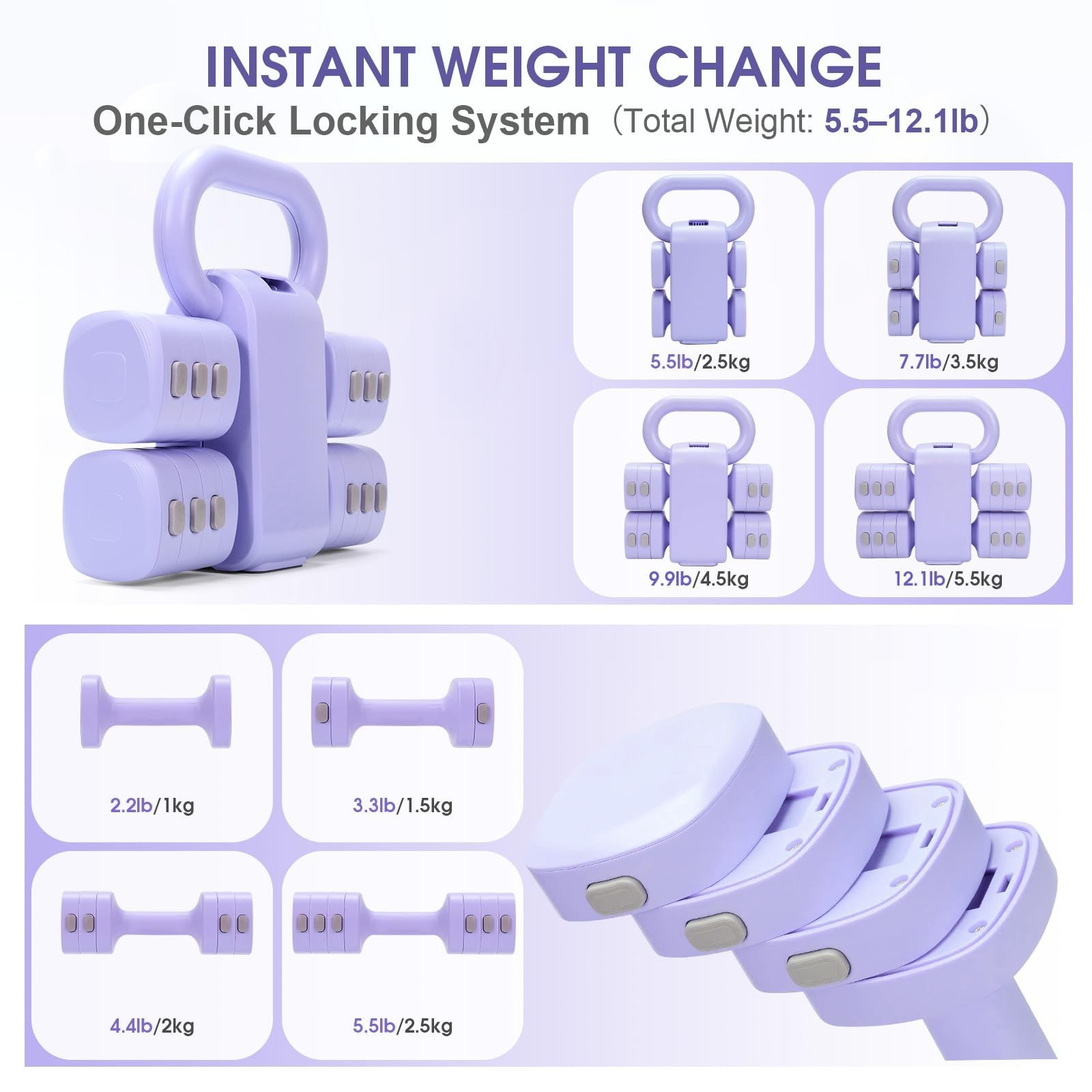 Brand Name: Axiqunel Part Number: Ax-dumbbell 2 Size: 11 inches Date First Available: July 26, 2025 Customizable Weight RangeEach dumbbell can be adjusted to 2.2lb, 3.3lb, 4.4lb, or 5.5lb using stackable plates. When combined with the kettlebell base, the total weight can range from 5.5lb to 12.1lb. You can adjust the weight level to match your fitness goals. Quick & Easy Weight ChangesChange weights instantly with a simple button pressno tools or complicated setup required. The secure lock holds everything firmly in place, even during tough workouts like kettlebell swings. Multi-Use Convertible SystemEasily switch between a full-