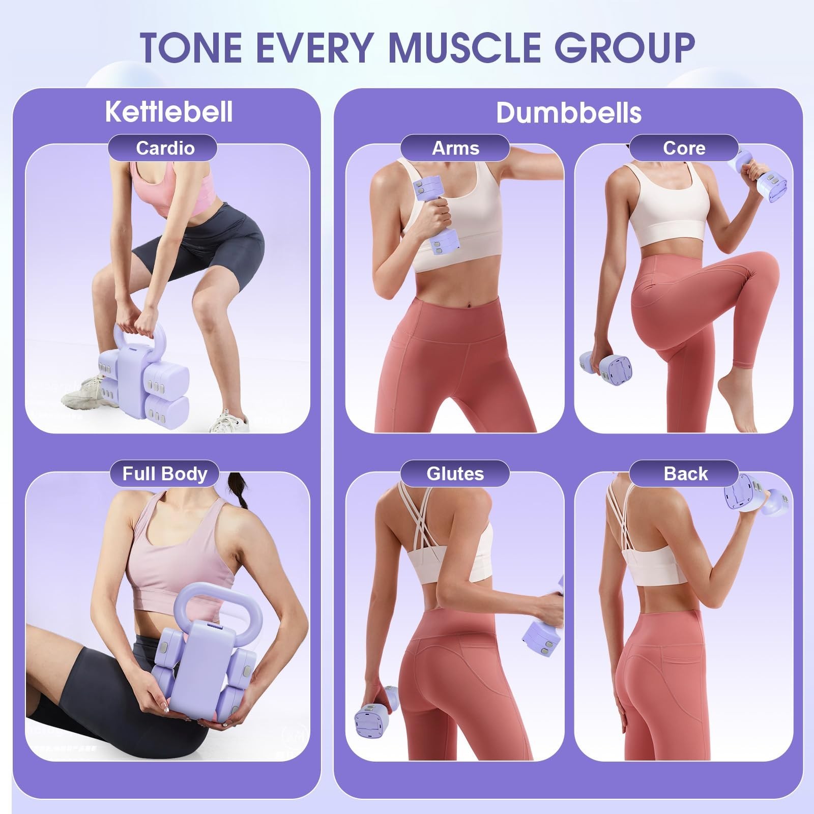 size kettlebell for full-body training and two adjustable dumbbells for focused workouts. The smart interlocking system makes conversion quick and secure—no extra tools or loose parts needed.