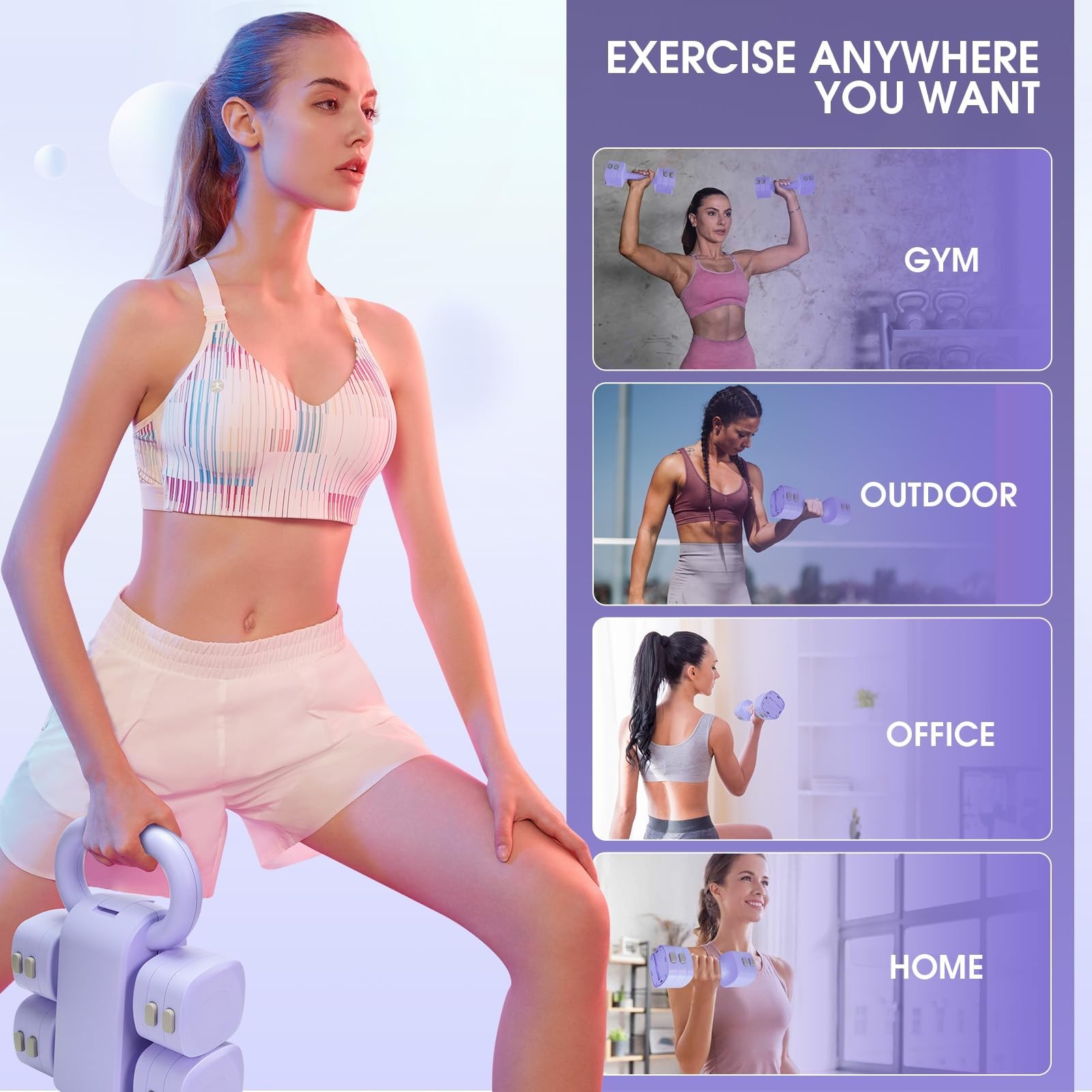 size kettlebell for full-body training and two adjustable dumbbells for focused workouts. The smart interlocking system makes conversion quick and secureno extra tools or loose parts needed. Comfortable & Secure Dual-GripThe dumbbells feature textured handles for a firm grip, while the kettlebell includes a wide, cushioned handle that's easy to hold during swings. A non-slip pad on the bottom helps protect floors and keeps it stable. Portable and Great for Any Workout SpaceCompact and lightweight, this set is easy to carry and storeperfect for use at home, in the office, outdoors, or at the gym. Whether you're strength training, toning, or doing cardio, it's ready for every routine. Easily switch between a full-