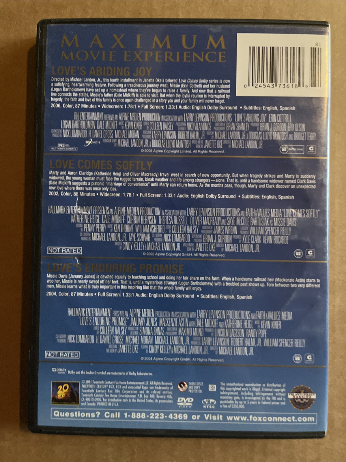 The product is a DVD set featuring three movies from the "Love Comes Softly" series: "Love's Abiding Joy," "Love Comes Softly," and "Love's Enduring Promise." The movies fall under the genres of drama and romance, and are presented in American English with NTSC video format. The set is in DVD format with a Region Code of 1 (US, Canada), housed in a tall/DVD case. Produced by 20th Century Fox, this set offers a collection of heartwarming and emotional stories for fans of romance and drama.