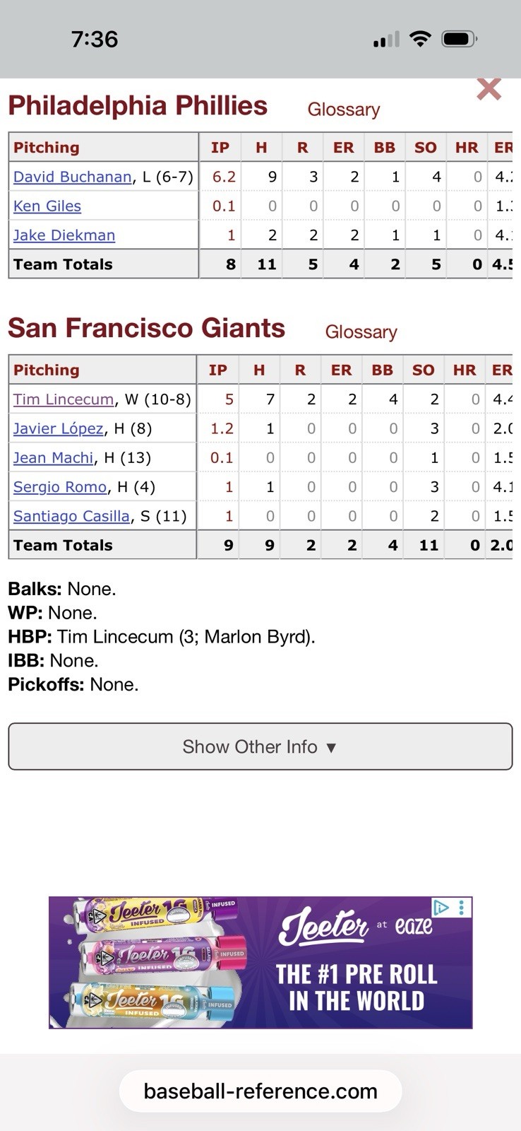 Tim Lincecum Career Win #99 Lineup Card 7/15/14 MLB Holo
