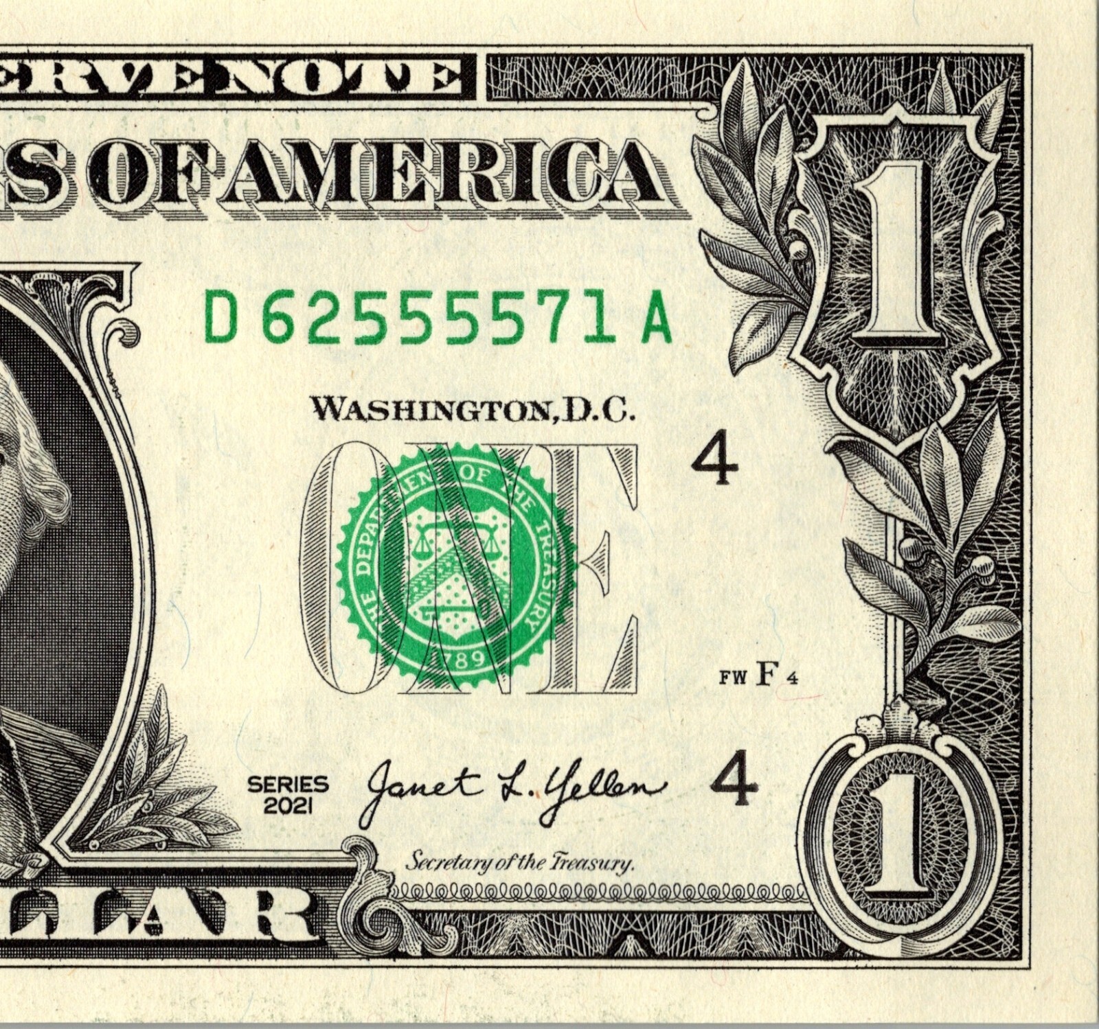 Four in a row Fancy Serial Number One Dollar Bill D62555571A CU