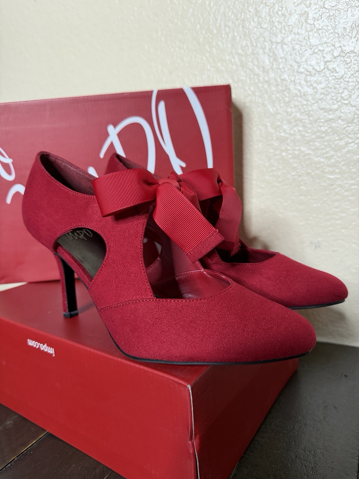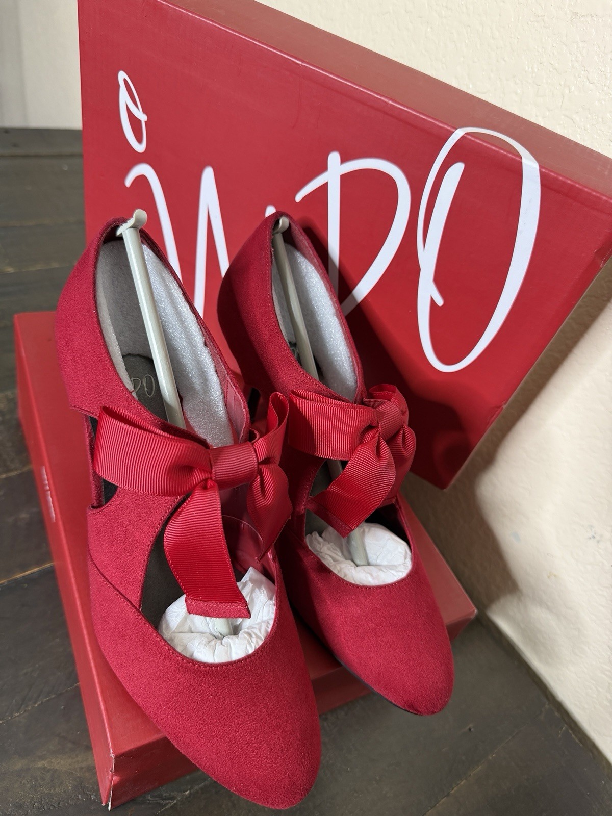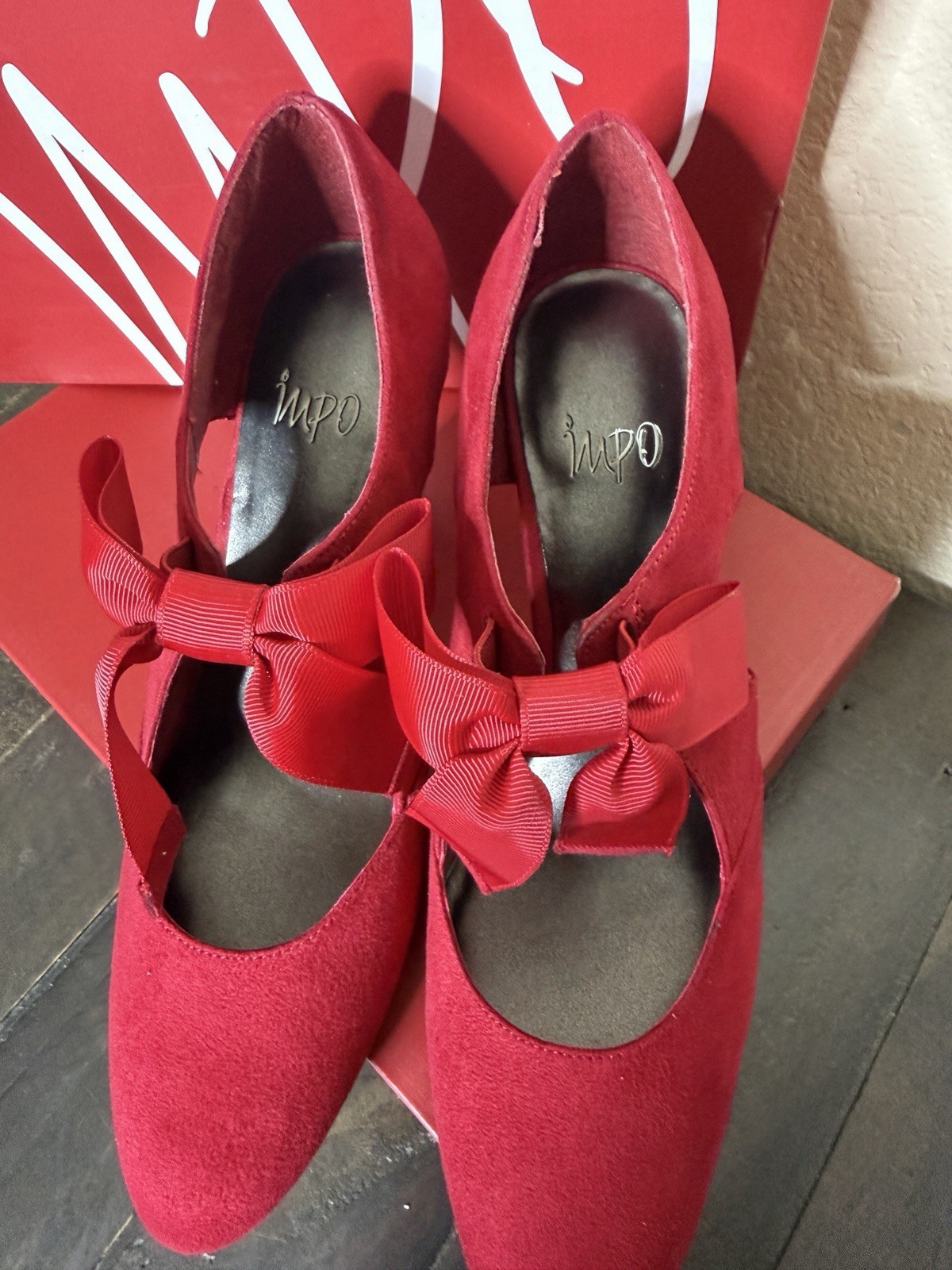 Elegant red suede pumps by Impo featuring a dramatic grosgrain bow and sculpted cutout design. The vibrant suede upper paired with the oversized bow gives these heels a bold statement look that works perfectly for formal events, holiday outfits, or evening wear. The sleek pointed toe and slim stiletto heel create a flattering silhouette while maintaining a comfortable fit. • Size: Women’s 7.5M • Color: Red • Material: Suede upper with grosgrain bow detail • Heel Height: 3.5” stiletto • Style: Tie-Time bow pumps with cutout sides • Condition: Excellent with boxFAST SHIPPING – We ship all items the next business day!BUNDLE – We bundle multiple items purchased and will return excess shipping paid!SMOKE FREE HOME. Returns accepted per platform policy.Priced to sell — feel free to reach out. Reasonable offers always considered.
