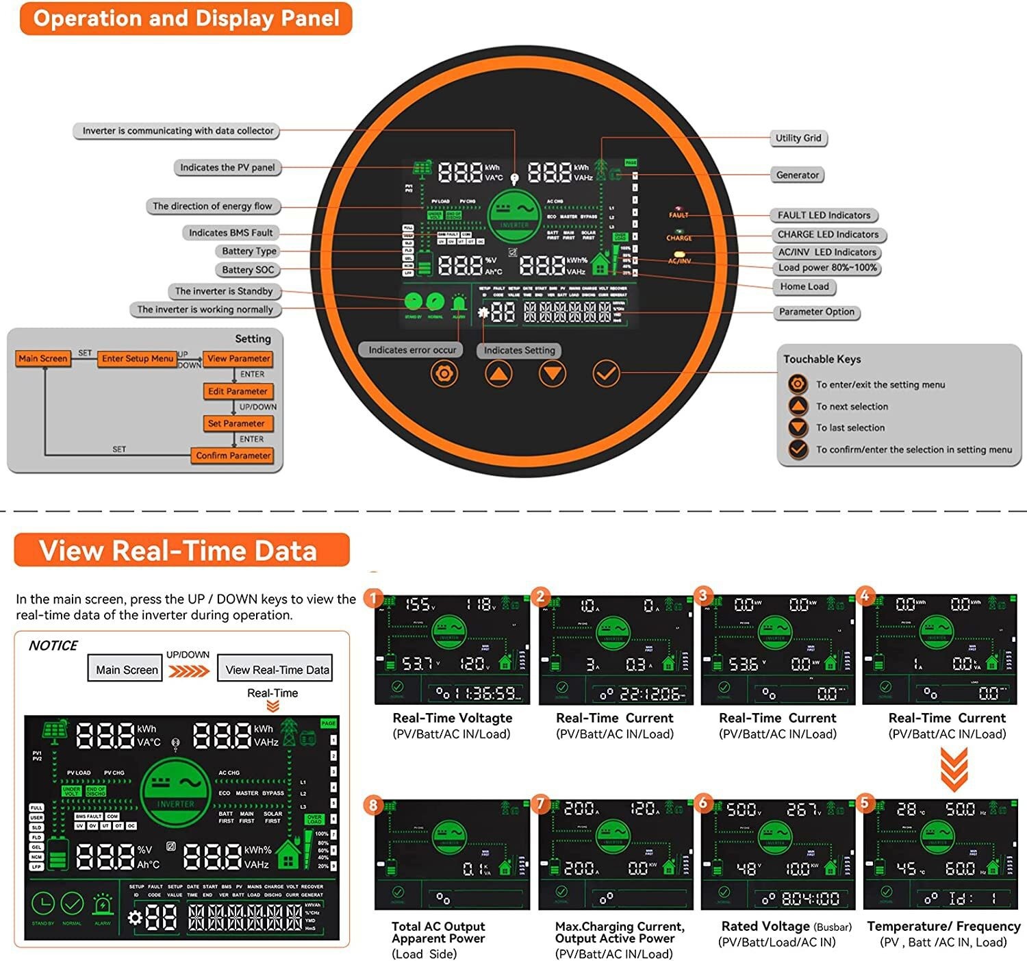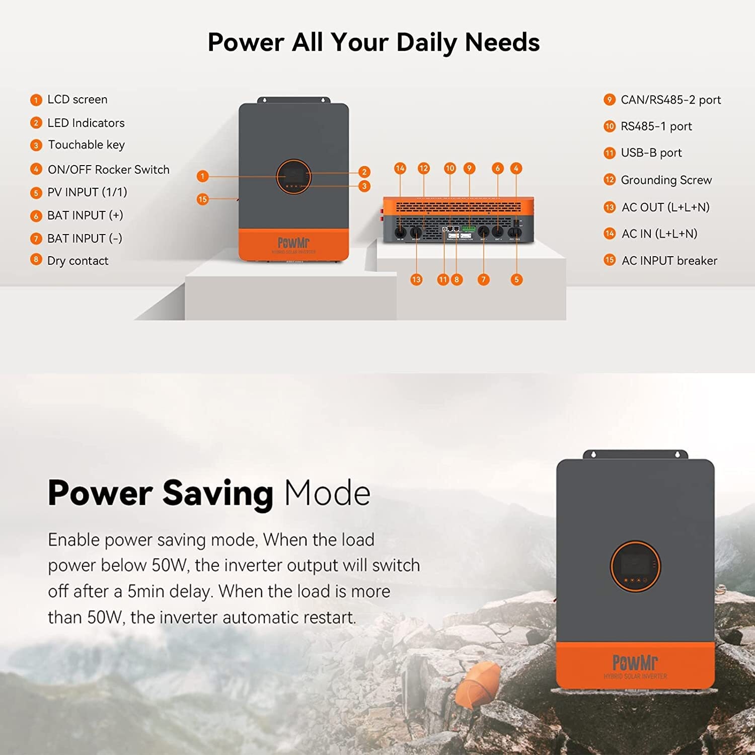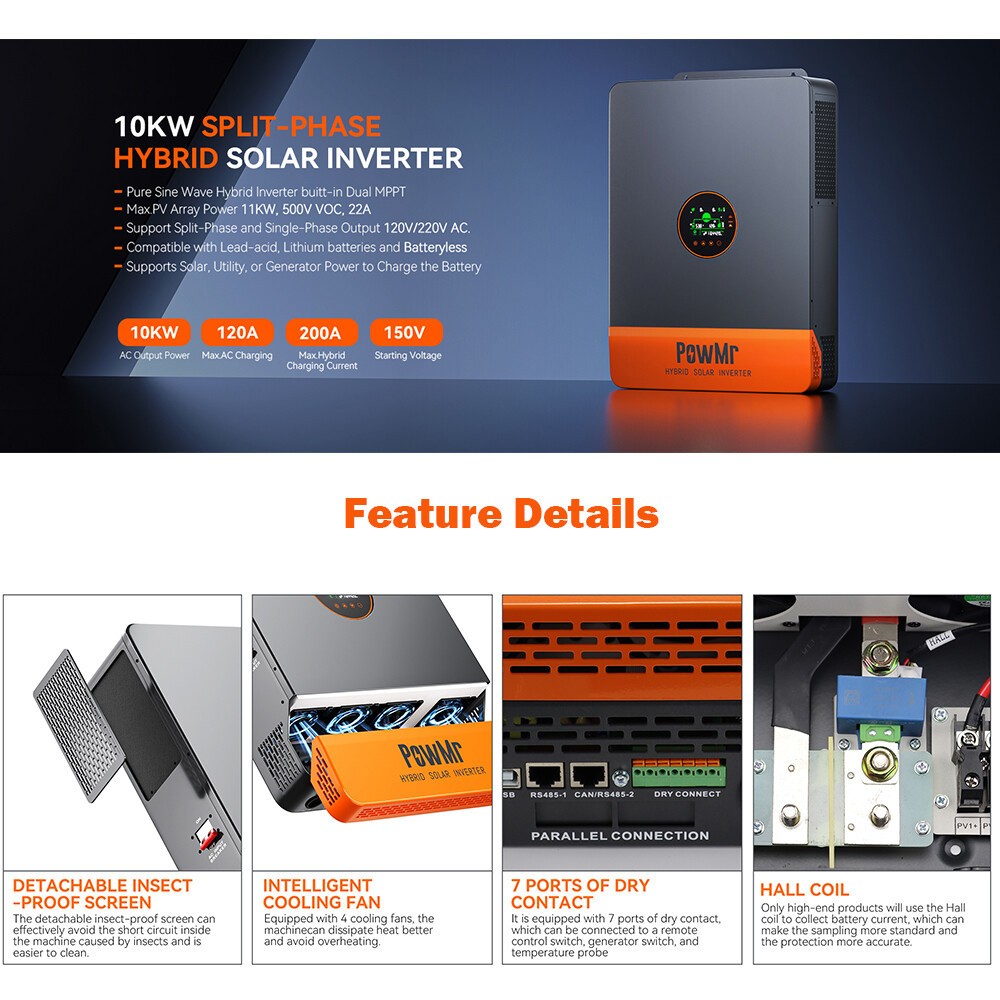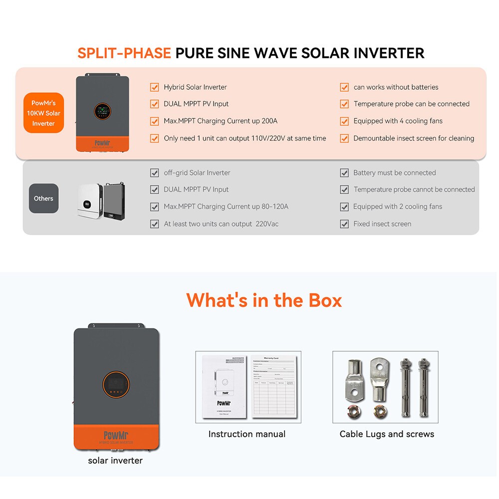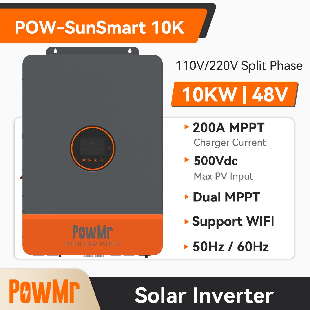 PowMr 10KW 48V 120V/240V Split Phase Solar Hybrid Inverter 200A MPPT ControllerInstructions 【10KW Solar Inverter】This is a solar inverter with both single-phase and split-phase functions. Is a new type of solar energy storage inverter control inverter integrating solar energy storage & utility charging and energy storage, AC sine wave output. It adopts DSP control and features high response speed,reliability, and industrial standard through an advanced control algorithm. 【14 Smart Protection Functions】: Multiple intelligent protections, such as PV input current/power limiting protection, PV input over-voltage, PV night reverse current protection, AC input over-voltage protection, AC input under-voltage protection, etc. 【Technical Specifications】: Max.PV array power:11000W, Max.MPPT Charging Current:200A, Rated Output Power:10000W, Max.Peak Power:20,000W, Rated Output Voltage:120/240Vac(split phase/single phase) , Max.Voltage of Open Circuit:500Vdc.Embedded Interfaces:RS485 / CAN / USB / Dry contact. 【Dual MPPT/Battery Type】: Dual MPPT with 99.9% efficiency and maximum 22A current in a single circuit, perfectly adapted to high power modules.Compatible with various batteries such as AGM, Gel, Lead-acid, Lithium-ion and LiFePO4 batteries, and supports battery-free. With a dual activation function when the li-ion battery is dormant; either mains/photovoltaic power supply access can trigger the activation of the li-ion battery. 【Single/Split-phase mode】: In split-phase mode: Output Voltage Range (L-N): 100~120Vac, 120Vac default, Output Voltage Range (L-L): 200~240Vac, 240Vac default. In single phase mode: Output Voltage Range (L-N): 100~120Vac, 120Vac default. 【Time-slot charging/Discharging function】:The POW-SunSmart series is equipped with a time-slot charging and discharging function, which allows users to set different charging and discharging periods according to the local peak and valley tariffs, so that the utility power and PV energy can be used rationally. 【Charging/AC output mode】: 4 AC output modes: Utility Priority Output, Solar and Utility Hybrid Output, Solar Priority Output, Inverter Priority Output. 4 battery charging modes: Hybrid Charging, Utility Priority Charging, Solar Priority Charging, Only Solar Charging. Advantages ⚫ Supports lead acid battery and li-ion battery connections. ⚫ With a dual activation function when the li-ion battery is dormant; either mains/photovoltaic power supply access can trigger the activation of the Li-ion battery. ⚫ Support split-phase and single-phase pure sine wave output. ⚫ Supports four different voltage levels of 100Vac, 105Vac, 110Vac, and 120Vac per phase. ⚫ Supports two solar inputs and simultaneous tracking of two solar maximum power charging/carrying capacity functions. ⚫ Dual MPPT with 99.9% efficiency and maximum 22A current in a single circuit, perfectly adapted to high-power modules. ⚫ 4 charging modes are available: solar only, mains priority, solar priority, and mixed mains/PV charging. ⚫ With the time-slot charging and discharging setting function, you can set the time period for cutting in/out of mains charging and switch the time period between battery discharging and mains bypass power supply mode. ⚫ Energy saving mode function to reduce no-load energy losses. ⚫ With two output modes of utility bypass and inverter output, with uninterrupted power supply function. ⚫ LCD large screen dynamic flow diagram design, easy to understand the system data and operation status. ⚫ 360° protection with complete short circuit protection, over-current protection, over under voltage protection, overload protection, backfill protection, etc.⚫ Support CAN, USB, and RS485 communication. Specification: MODELPOW-SunSmart 10K CAN BE SET INVERTER OUTPUTRated Output Power10,000WMax. Peak Power20,000WRated Output Voltage120/240Vac (split phase/single phase)YLoad Capacity of Motors6HPRated AC Frequency50/60HzYWavefomPure Sine WaveSwitch Time10ms (typical)Parall capacity/BATTERYBattery TypeLi-ion / Lead-Acid / User DefinedYRated Battery Voltage48VdcVoltage Range40-60VdcYMax.MPPT Charging Current200AYMax.Mains/Generator Charging Current120AYMax.Hybrid Charging Current200AYPV INPUTNum. of MPP Trackers2Max.PV aray power11,000WMax.input current22/22AMax Voltage of Open Circuit500VdcMPPT Voltage Range125-425VdcMAINS / GENERATOR INPUTInput Voltage Range90-140VacFrequency Range50/60HzBypass Overload Current63AEFFICIENCYMPPT Tracking Efficiency99.90%Max. Battery Inverter Efficiency92%GENERALDimensions620*435*130mm (2*1.4*0.4ft)Weight21kg(46.3lb)Protection DegreeIP20, Indoor OnlyOperating Temperature Range15~55℃,>45℃ derated (5~131℉,>113℉ derated)Noise<60dBCooling MethodInternal FanWarranty2 YearsCOMMUNICATIONEmbedded InterfacesRS485 / CAN / USB / Dry contactYExtemal Modules (Optional )Wi-Fi/ GPRSYCERTIFICATIONSafetyIEC62109-1, IEC62109-2,UL1741EMCEN61000-6-1, EN61000-6-3, FCC 15 class BRoHSYes Package Include:1X The unit1X User manual PowMr EverywhereDelivery detailsTerms of salesPaymentContact usPowMr EverywherePowMr is a global solar energy innovation application company. In the past ten years, we have provided related products and services to more than 150 countries around the world, and are committed to promoting solar energy products to more application fields and scenarios. We advocate new energy life, improve new energy ecological technology, protect the natural environment, and realize the common progress of man and nature. Why PowMr?- Fast Delivery- Free Shipping- 12 months warranty一Avg. response time 1 Hrs(WorkingDay)- PowMr Everywhere 1. “Highly Quality first, customer orientation”is our purpose.2. PowMr will be committed to provide the best service to you!Delivery details🚚 Our warehouse is located in US, your orders will be shipped from our US warehouse.🚚 PowMr offers a variety of shipping methods such as USPS, UPS, FEDEX. Any items that qualify for free shipping will be id