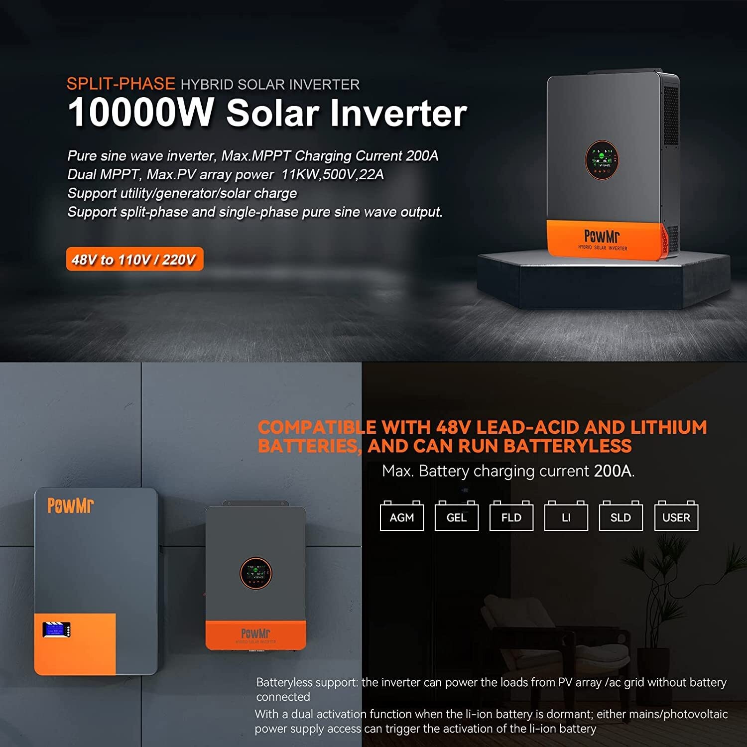 PowMr 10KW 48V 120V/240V Split Phase Solar Hybrid Inverter 200A MPPT Controller