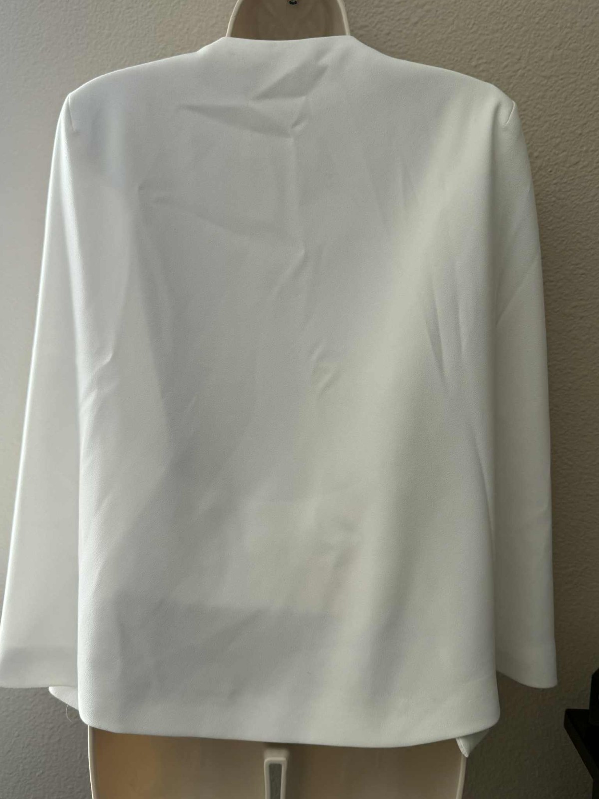 White Open-Front Blazer Jacket – Long Sleeve, Minimalist, Women’s Chic WorkwearElevate your wardrobe with this sleek white open-front blazer. Designed with a clean, minimalist silhouette, this jacket pairs perfectly with both professional and casual outfits. The smooth fabric and long sleeves create a polished look without buttons for an effortlessly modern style. Features Color: White Open-front design Long sleeves Minimalist / modern look Lightweight and versatile Condition Gently used; in great overall condition May show minor wrinkles from storage Ideal For Office / business casual Evening outings Layering over tops, dresses, and blouses A timeless essential that adds sophistication to any outfit!