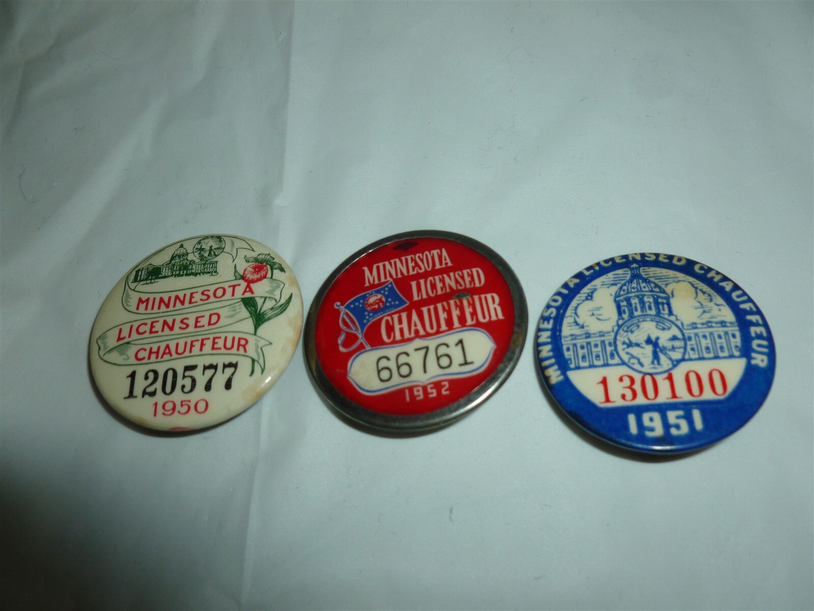 3 Vintage 1950, 1951 AND 1952 Minnesota Chauffeur Pinback Licenses Lot A-572