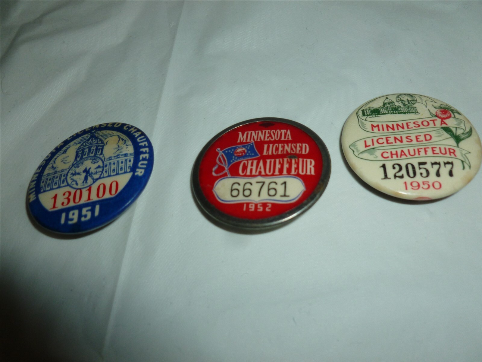 img *** FOR MORE GREAT DEALS SEE OUR eBay STORE AT https://www.ebay.com/str/ymee *** This auction is for 3 Vintage 1950, 1951 AND 1952 Minnesota Chauffeur Pinback Licenses, as pictured. Thanks for looking at our ad. This is proof positive that MN will tax anything. This is the land of 10.000 taxes. We have a lot of ads on eBay. Please check them out...if you purchase more than one lot, we will do our best to combine shipments and reduce your shipping costs....We'll be posting a number of Collectible Pinbacks that we recently purchased from a collector. Be sure to check out these ads. We are not pinback experts. If you see anything incorrect or misleading in our ads, please email us and we will make any relevant corrections to our ads. This auction is for a 1926 MN chauffeur license, as pictured. Please check out the pictures!!!! We have a lot of ads on eBay. Please check these ads out in our eBay company store. Pinbacks are listed in the “Pinbacks, Badges & Medals” section. COMBINED SHIPPING COSTS: We like to combine multiple sales and reduce shipping costs, however we get penalized by eBay if we don’t ship paid orders in one business day. So if you want to combine orders on auctions that that come due over several days, please do us a favor. When you win your first auction DO NOT PAY IMMEDIATELY. Drop us a note that you are bidding on more auctions then tell us when you are done bidding. We will then send an invoice with reduced shipping and ship your order in one business day…..If this is too confusing (the eBay rules confuse us too)….do whatever is easiest for you and we will make it right. We appreciate your bids!!!! Powered by SixBit's eCommerce Solution