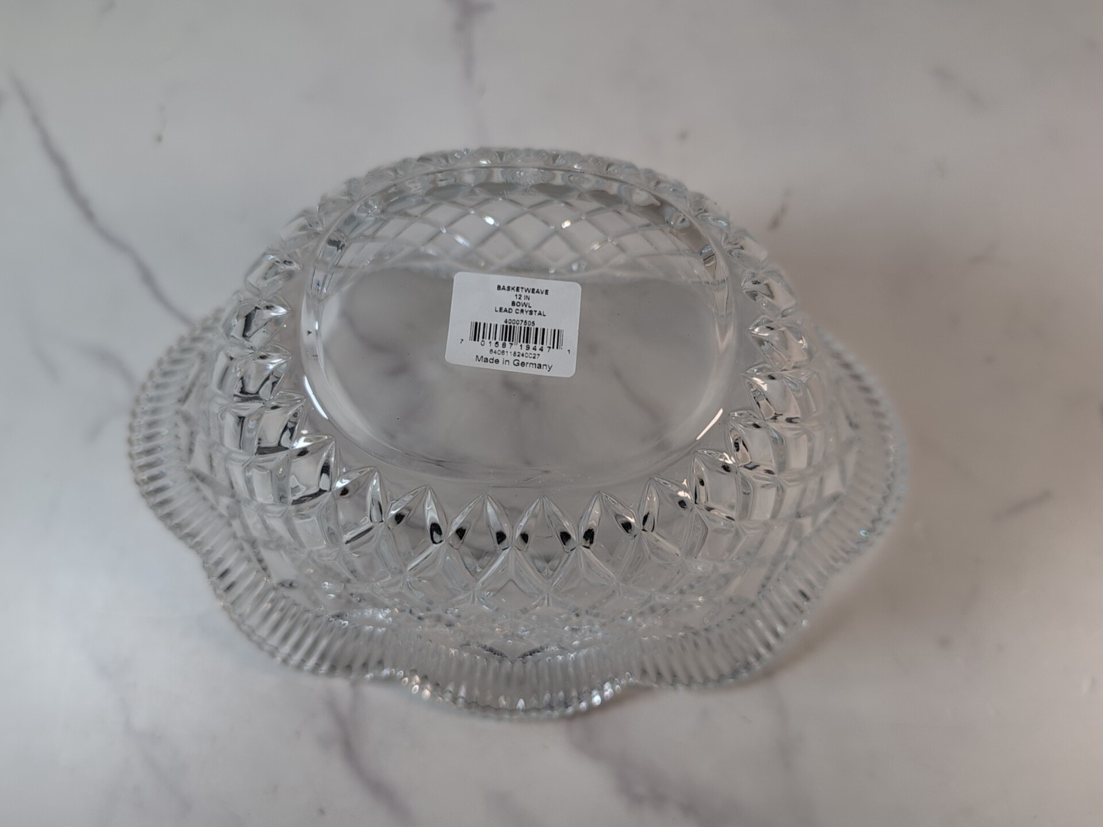 The Marquis by Waterford 12" Basketweave Crystal Bowl is a stunning piece of elegant glass from Germany. This centerpiece bowl features a basketweave pattern in clear crystal, standing at a height of 6 inches and measuring 11.75 inches in length and 8 inches in width. The backstamp is etched, adding a touch of authenticity to this original Waterford piece. Perfect for adding a touch of sophistication to any dining table or living space, this bowl exudes luxury and style.