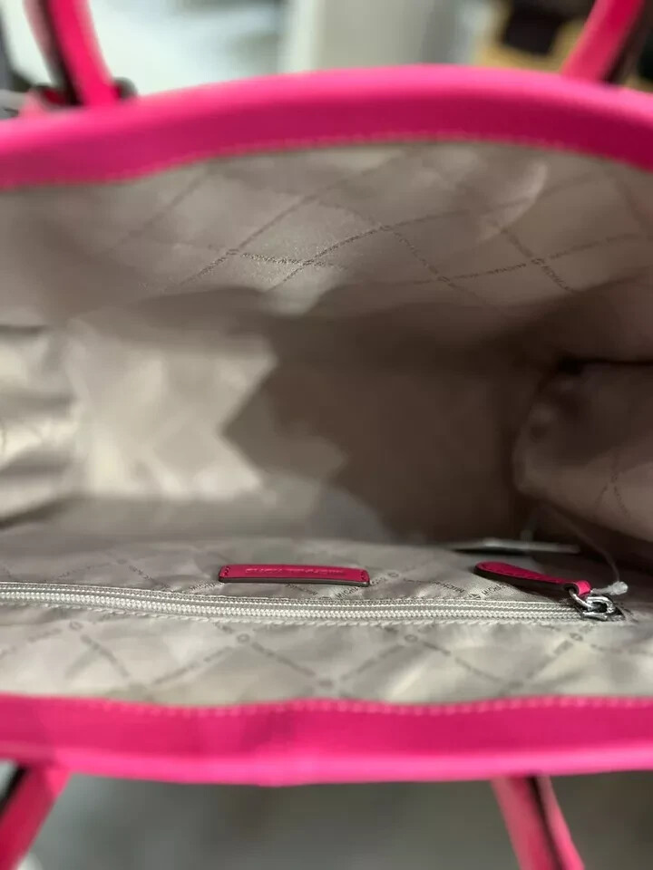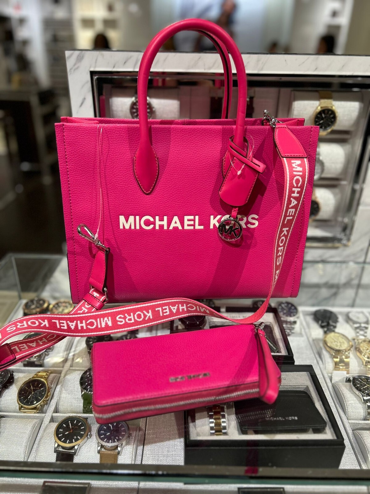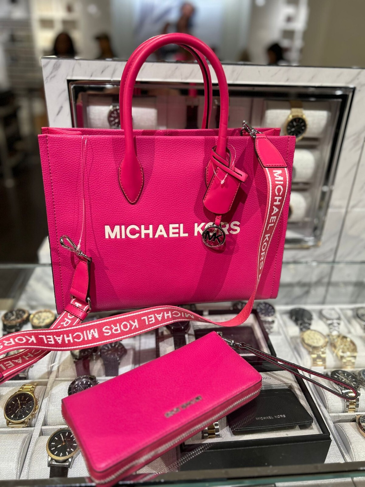 MICHAEL KORS MIRELLA LEATHER TOTE BAG + CONTINENTAL CARD WALLET SET IN DRAGONFRUIT ABOUT THE ITEMTOTE BAG DETAILSPlease look at approximate dimension below before purchasing. APPROX. DIMENSIONS: Bottom Width (L): 14 inchesHeight (H): 10.75 inchesDepth (D): 4.75 inchesSize: Medium (M)Shorter straps: 4.5 inchesLonger strap: Adjustable100% Authentic or Money Back Guarantee~~~ALWAYS!!!FEATURES:Silver Toned HardwareLeather MaterialMichael Kors Logo At FrontCustom Fabric Lining1 Zipper PocketCONTINENTAL WALLET DETAILSAPPROX. DIMENSIONS: Width (W): 8.25 inchesHeight (H): 4 inchesDepth (D): 1 inchRemovable Strap: 8 inchesPowered by ExportYourStore.com