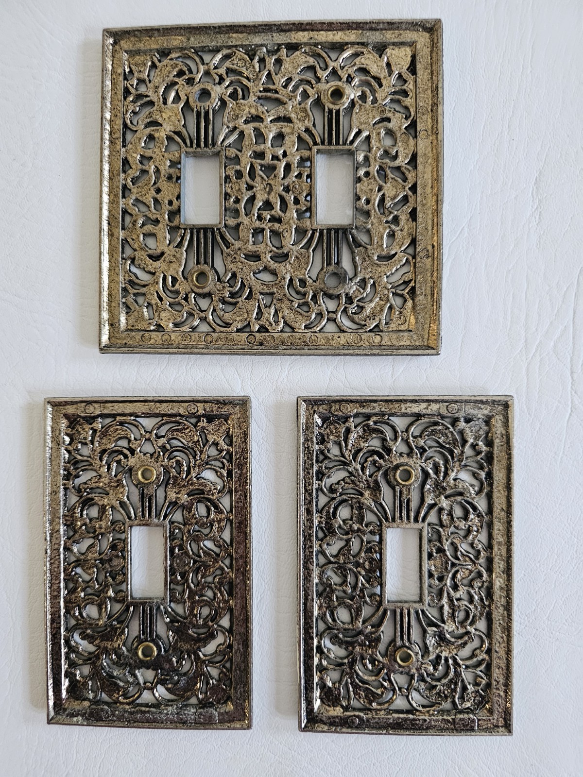 Here is a lot of three (3) vintage switch plate covers: Two (2) single plates and one (1) double. Ornate filigree roses and scrolls in ornate style. Gun metal/silver type color. Made of metal (likely brass). The singles measure about 2 7/8 inches wide by 4.5 inches tall; the double measures about 4.5 inches square. No manufacturer marks. These switchplates likely date from the 1960s/1970s era.These are used, pre-owned items. There are no screws included. There are