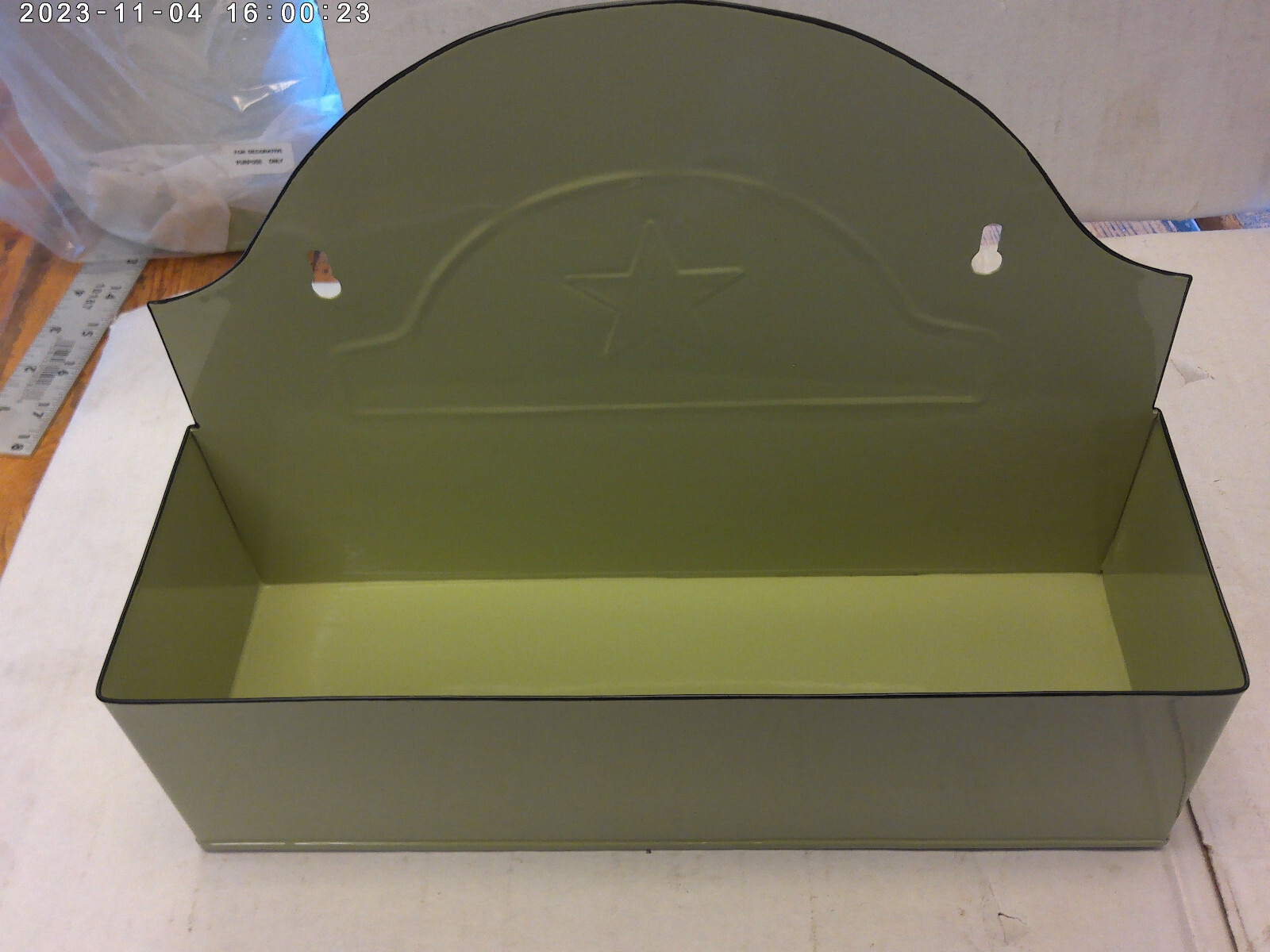 This decorative enamelware mail holder/planter box is designed in a charming avocado green color, adding a touch of vintage flair to any space. Measuring 6 inches in height, 10 inches in length, and 5 inches in width, it is the perfect