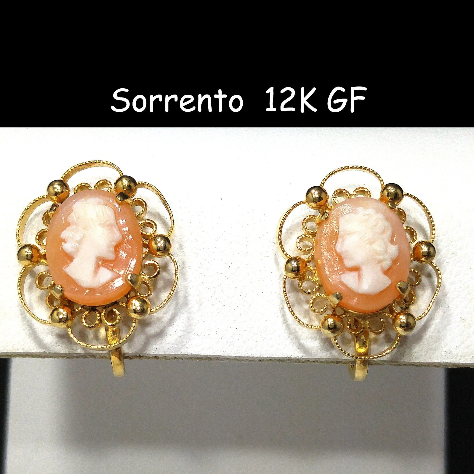 *Description: This is a beautiful and unique set of Sorrento hand carved shell earrings in 12K GF from the 1950s. Sorrento's jewelry was gold filled or sterling silver. Each earring is a unique design due to the hand carving of the shell. The cameo is framed in a filigree design. There are clips on the back of each and each earring only weighs about ounce so they are very comfortable on your ears. This would be a great addition to your vintage jewelry collection or make a great vintage gift!*Approximate Measurements: Length - 3/4 Inch, Width - 5/8 Inch, Weight - Ounce, Cameo Carving Length - 7/16 Inch*Condition: Great vintage condition. Will see signs of wear under magnification. See photos for details.*Hallmark: Sorrento, 12K GF*Item E3583