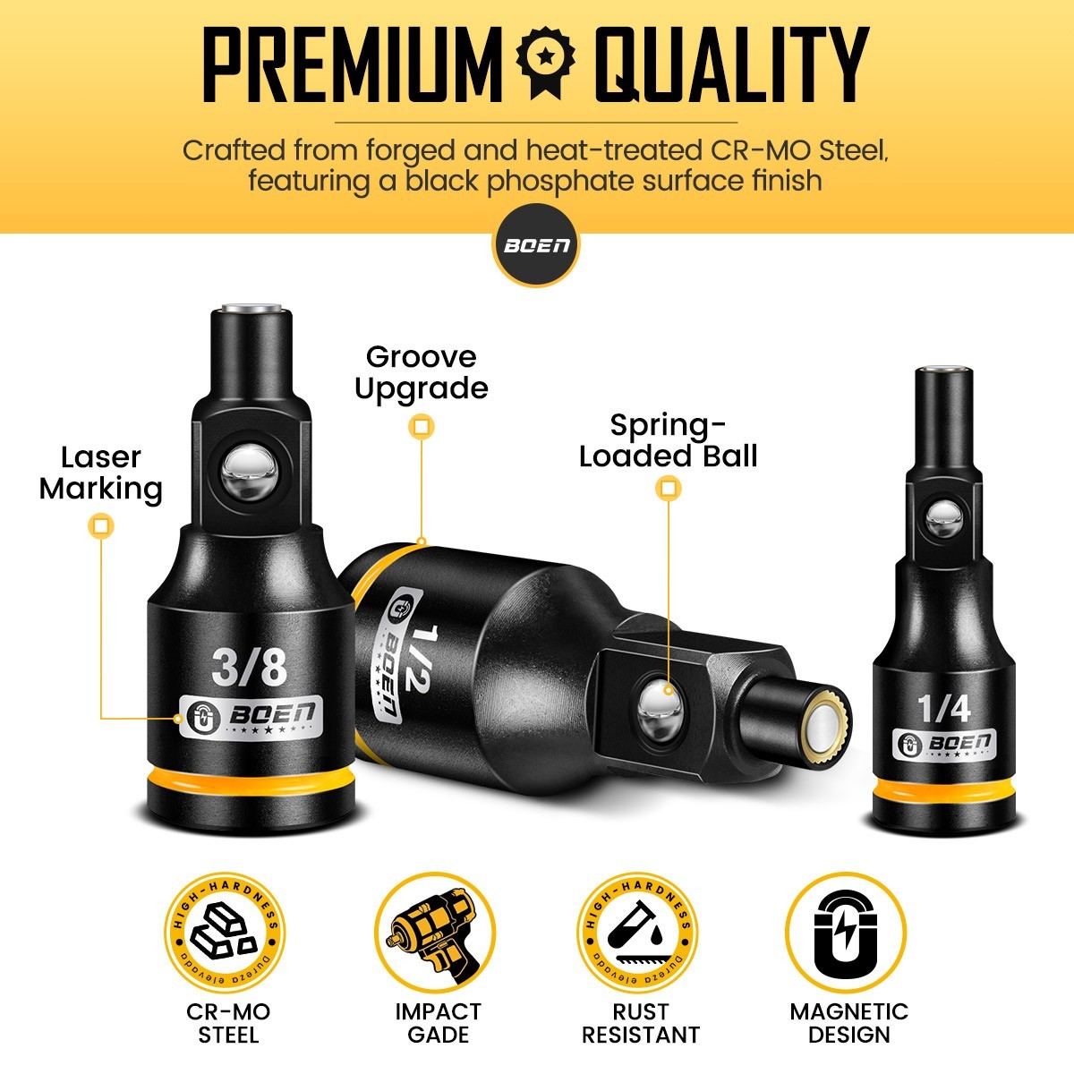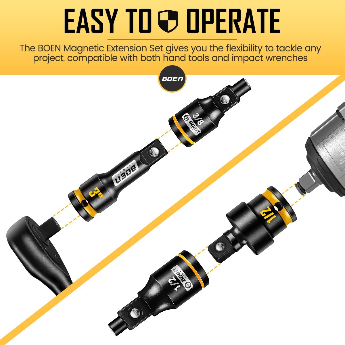 Multi-Specification Compatibility: BOEN magnet socket extension adapter set includes 3 common drive sizes: 1/4", 3/8", and 1/2", which can adapt to a variety of sockets and wrench. Whether for everyday household repairs or professional automotive maintenance, the combination of these 3 sizes ensures broad applicability. Users can complete various repair tasks without needing to purchase multiple adaptersMagnetic Design for Enhanced Convenience: the unique magnetic design incorporates strong magnets both inside and outside the socket heads, which can securely hold nuts, bolts, and other metal parts. Even in complex repair environments, this feature helps prevent small components from getting lost, reducing the hassle of searching and increasing overall work efficiencySolving Common Problems: For hard-to-reach spaces, traditional tools often fall short. This extension adapter easily reaches narrow areas, making it especially useful for repairing car engines or mechanical equipment. Coupled with the magnetic function, it ensures that screws and nuts stay in place and don't get lost, saving time and reducing unnecessary delays. The 3