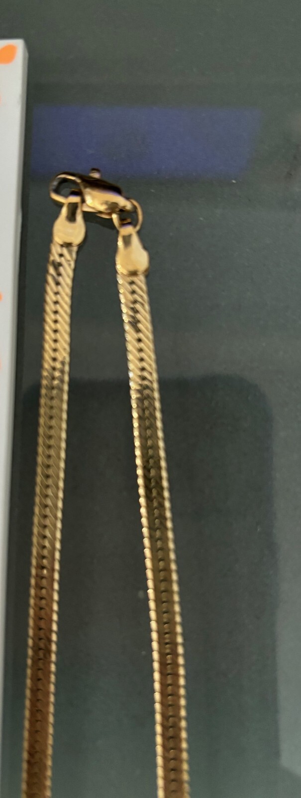 This is a lovely bright gold herringbone 24" chain 1/8" wide (4mm) that looks brand new. There are no markings on the chain, and it is very lightly magnetized, so I am assuming it is gold plated, but I make no guarantees. It has been in my closet for about 25 years with very little usage, and shows no signs of wear or discoloration.Please ask any questions prior to purchase, because this item is not returnable.